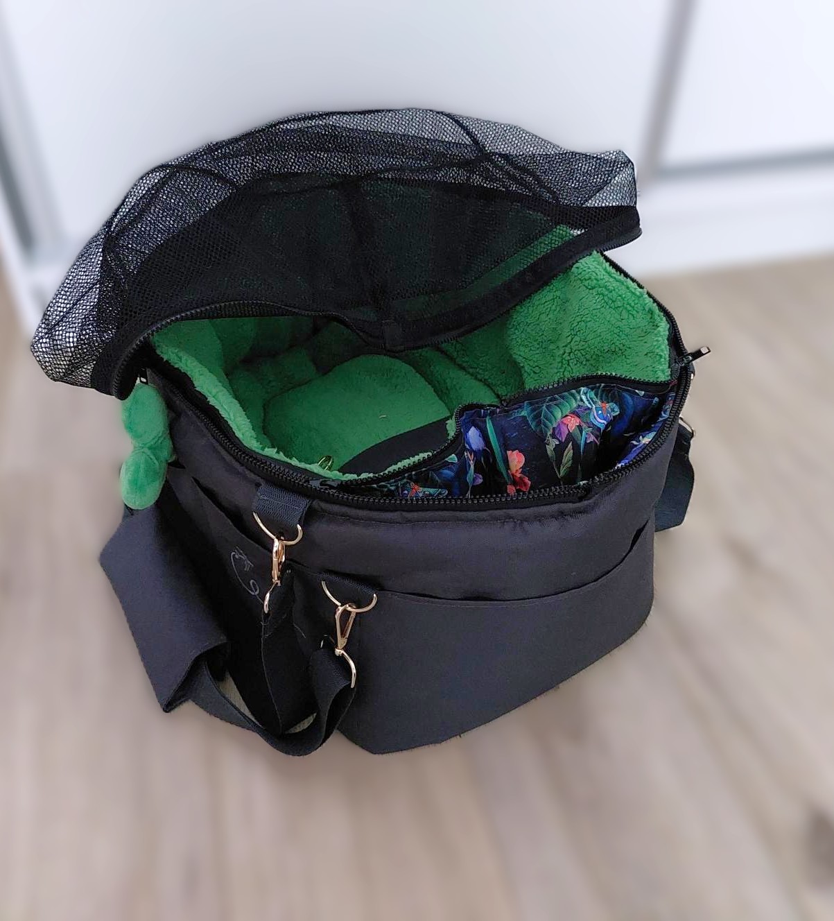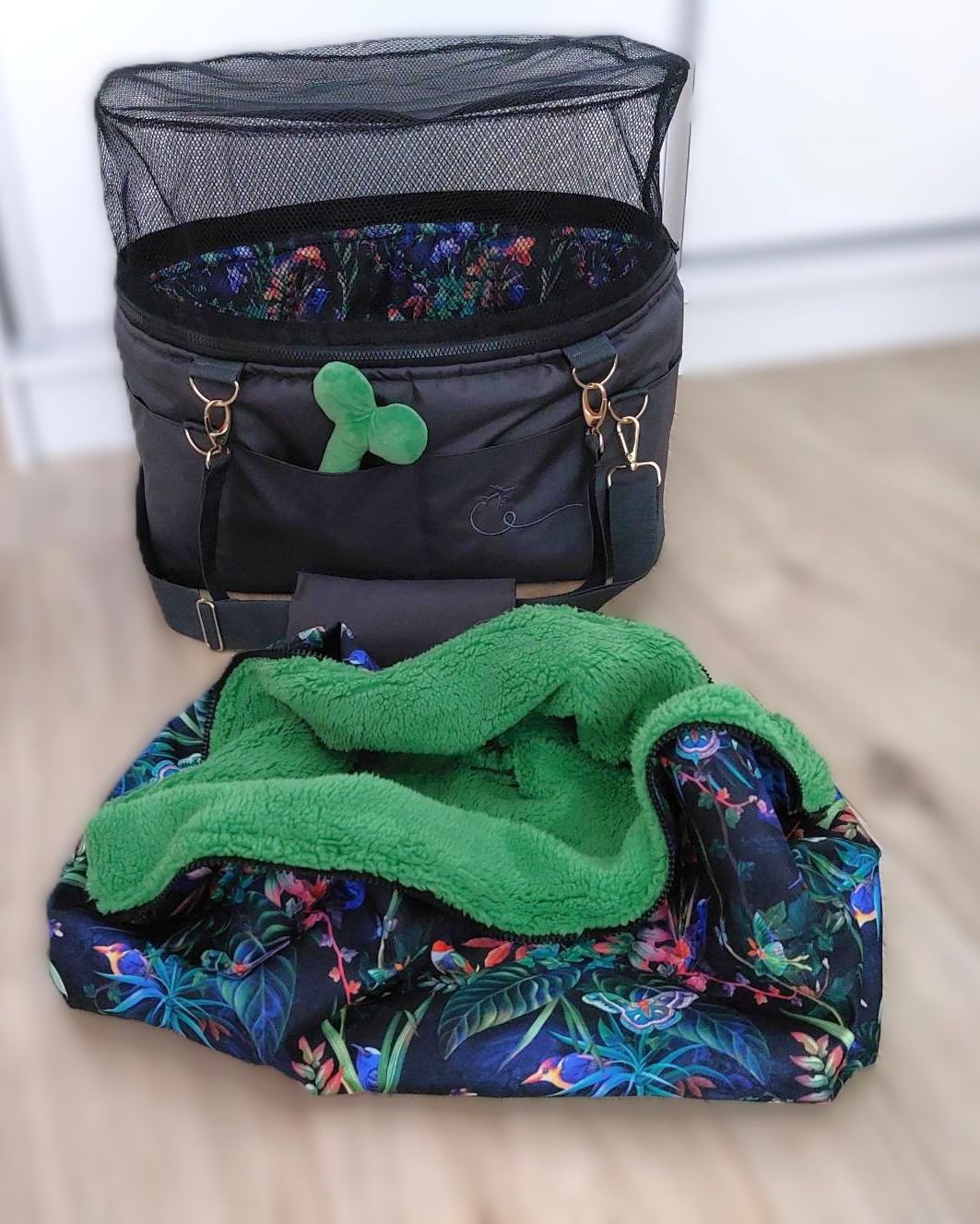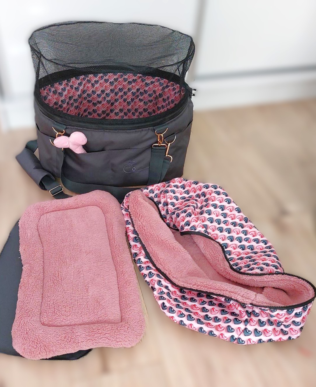 Ružová láska alebo zelená džungľa? "Cestujte štýlovo so psíkom! Naša letecká taška: Ružová so srdiečkami pre romantikov. Zelená džungľa pre dobrodruhov. Pohodlná kožušinka a nastaviteľná sieťka na mieru.