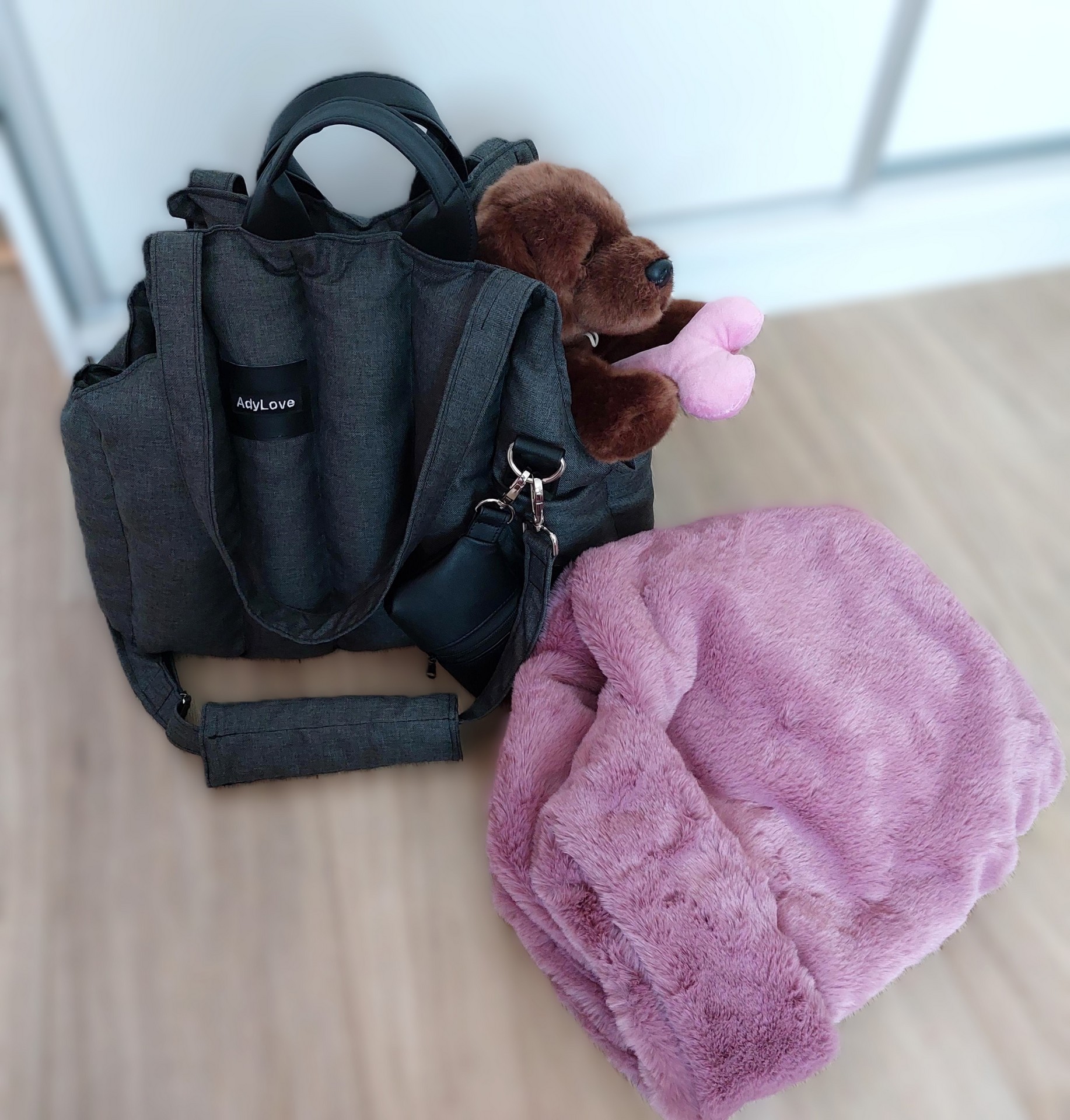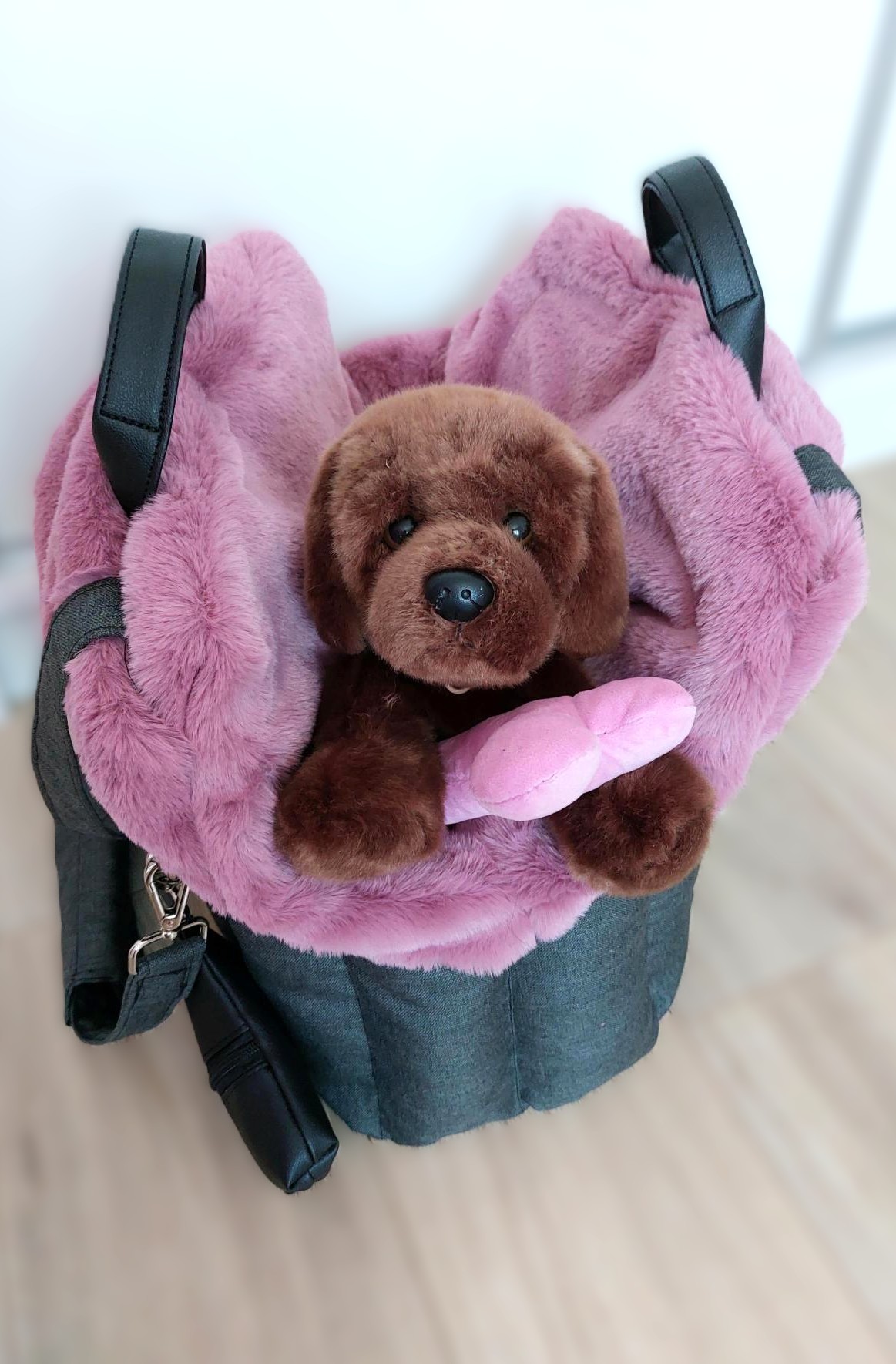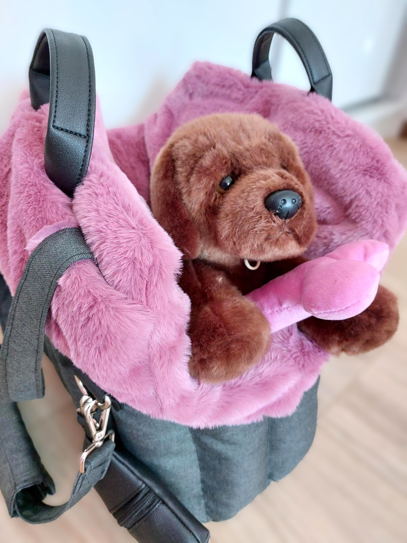 Prenosná taška rozmer 45 x 20 cm, farba antracit s ružovou vyberateľnou kožušinou.