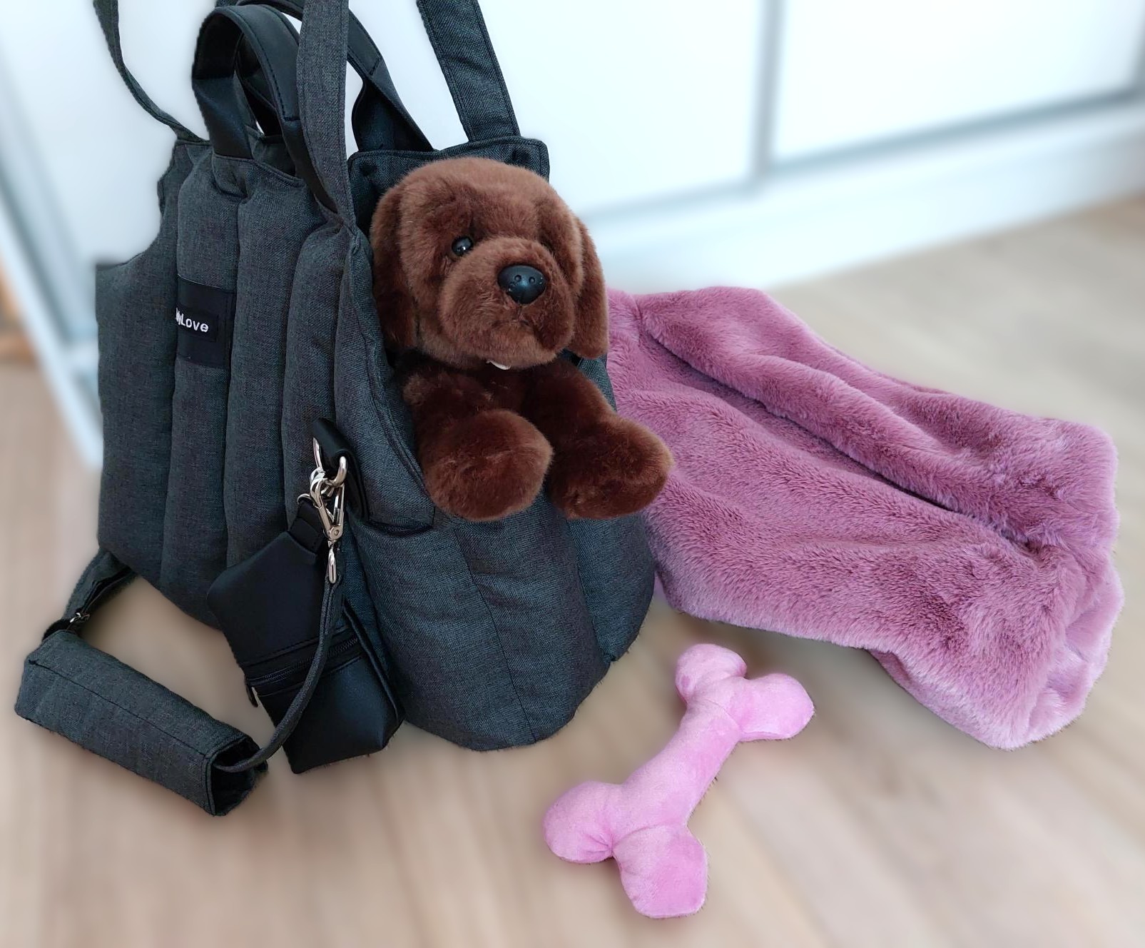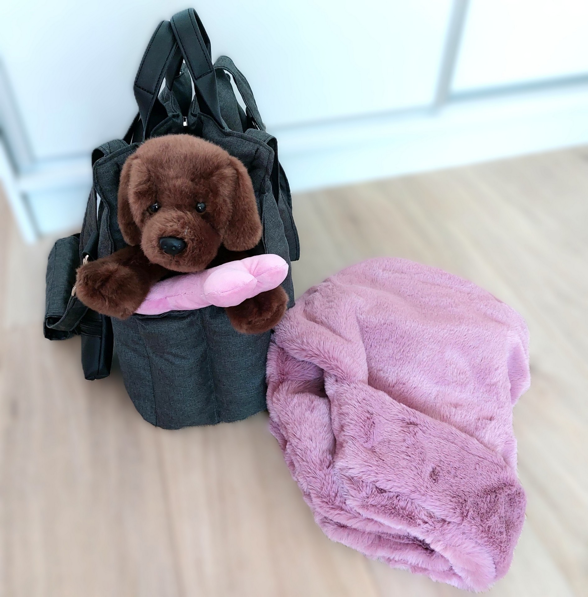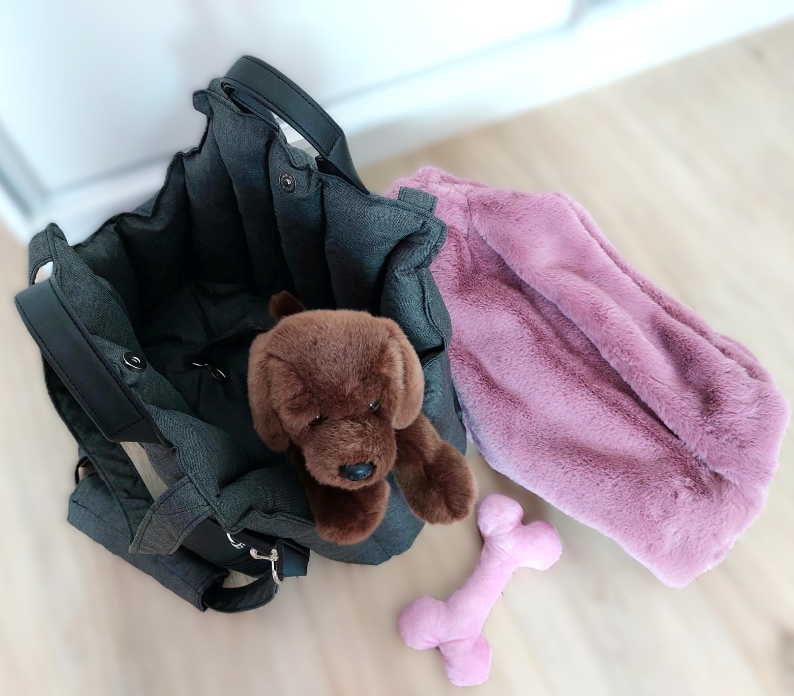 Prenosná taška rozmer 45 x 20 cm, farba antracit s ružovou vyberateľnou kožušinou.