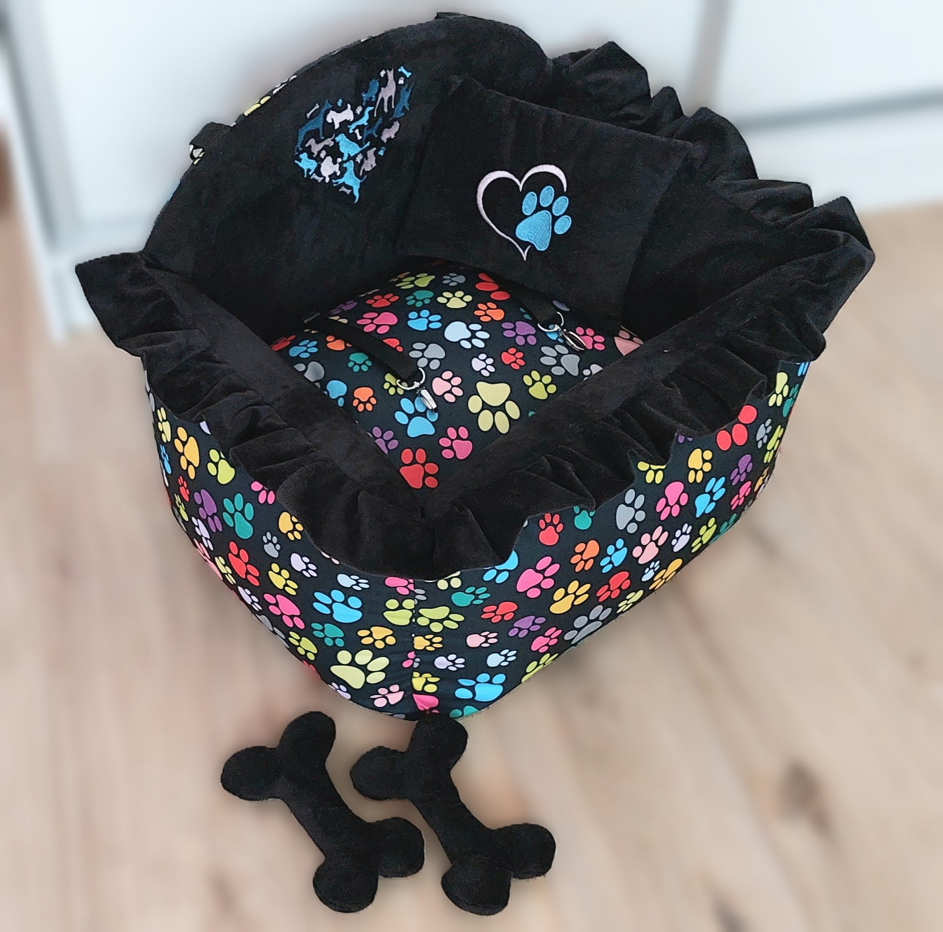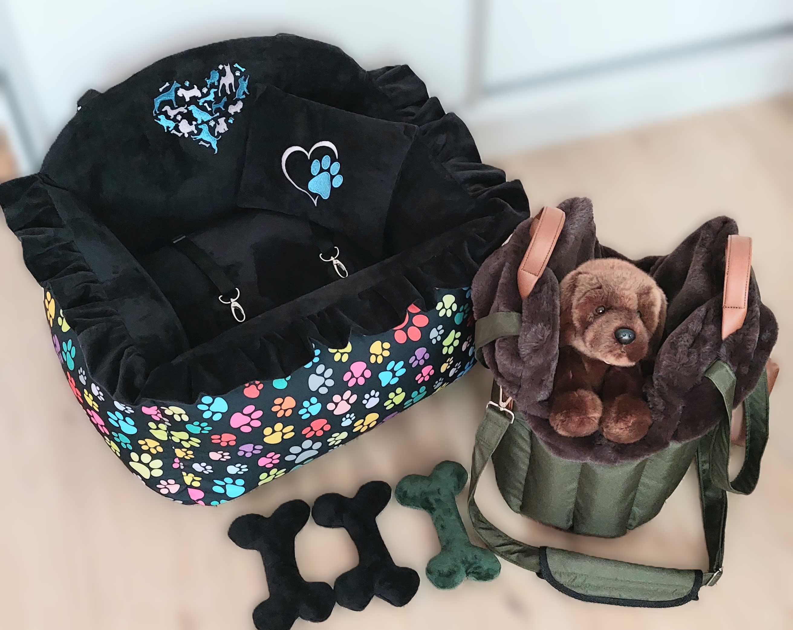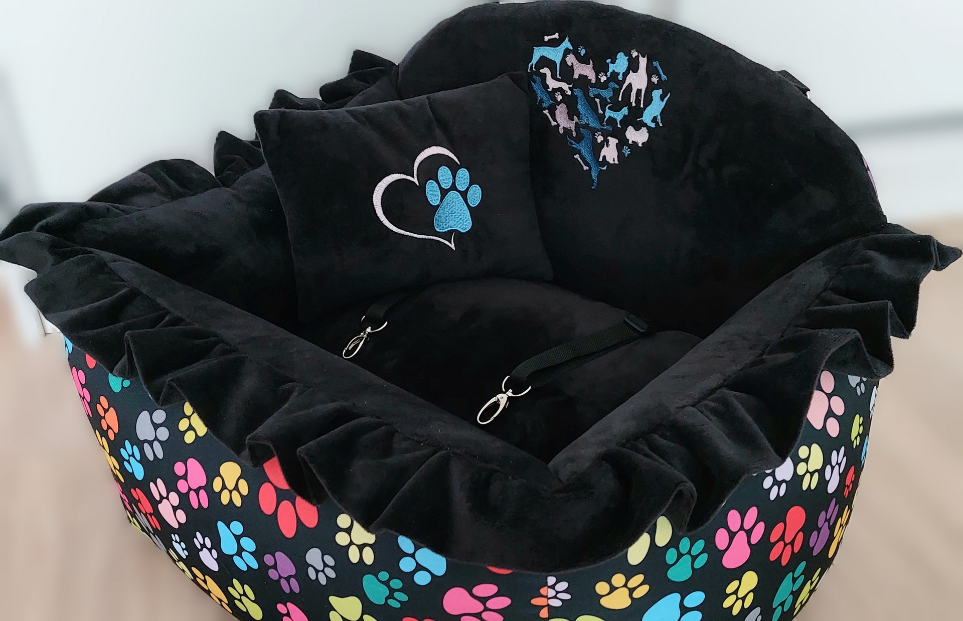 Autosedačka vo veľkosti 50 x 40 cm pre dvoch psíkov. V kombinácii vodeodolnej labky so zamatovou čiernou. Vankúš vyberateľný obojstranný, s jednej strany labka, z druhej zamatová čierna. Celá autosedačka je na zips.