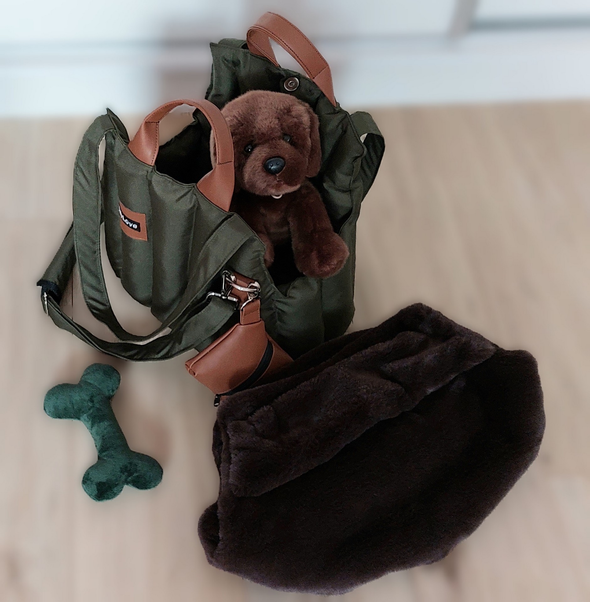 Prenosná taška vo veľkosti 32 x 20 cm s vyberateľnou kožušinou. Farba ARMY zelená, hnedá kožušina. Vo vnútri tvrdená podložka pre pevné dno, vyberateľný vankúš v zelenej farbe. Darček kostička.