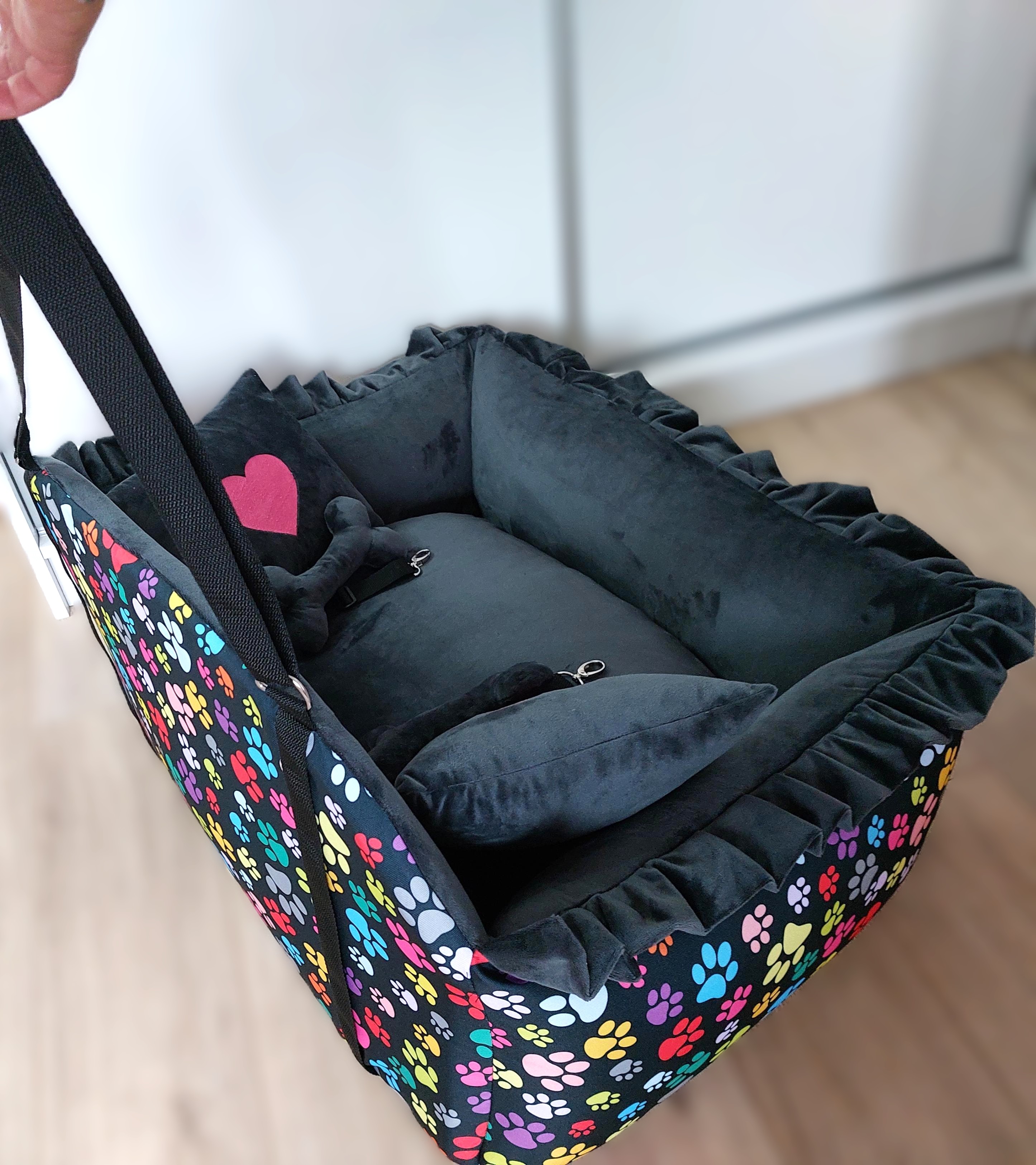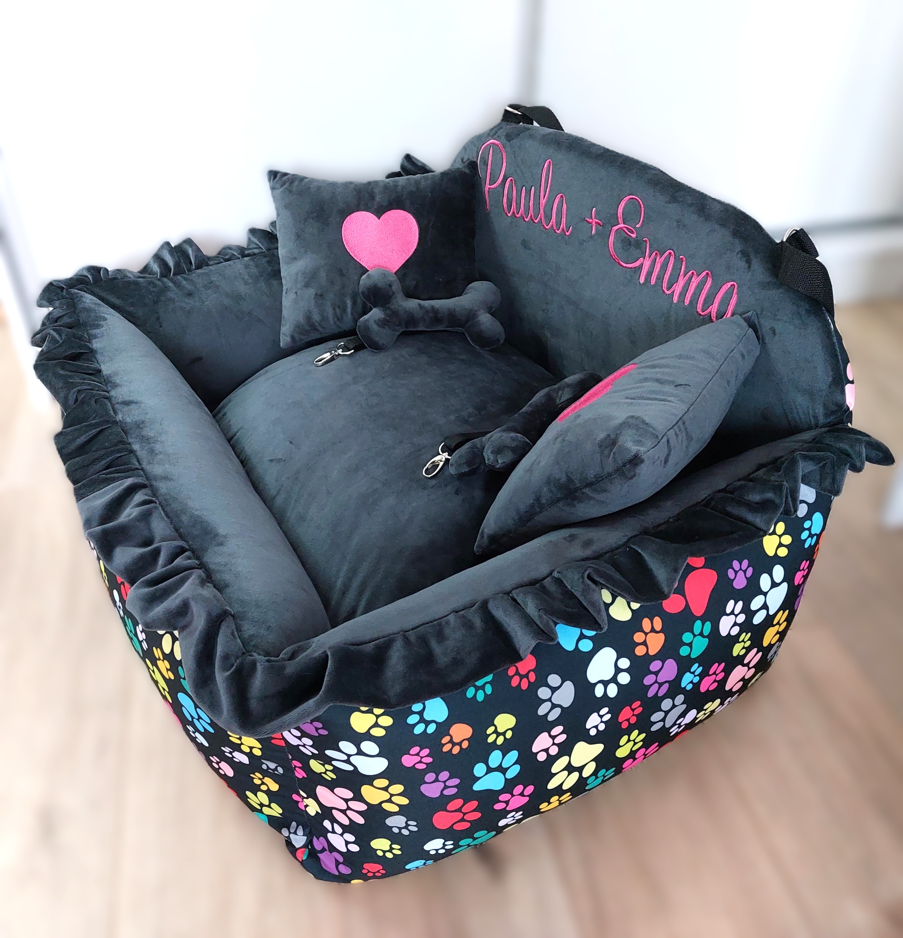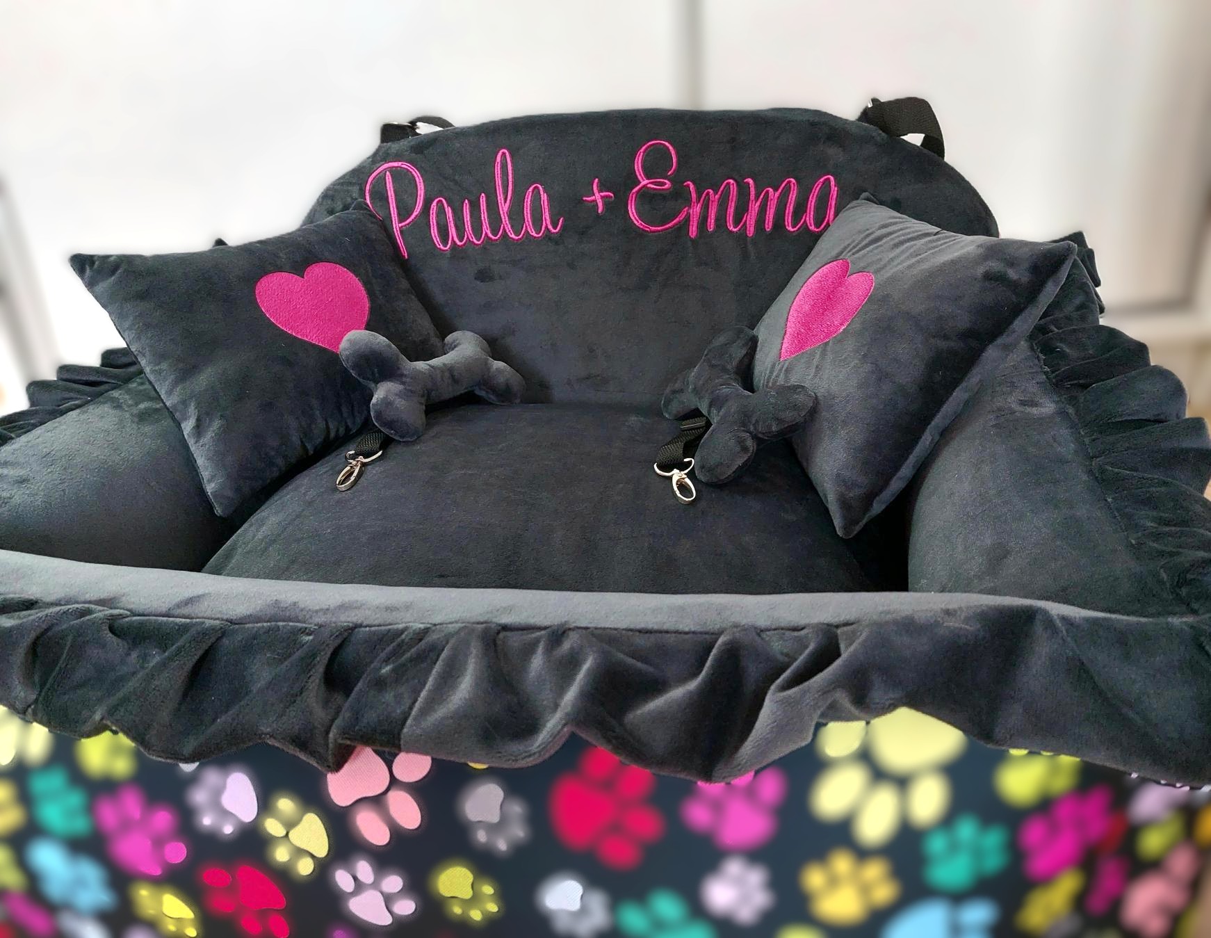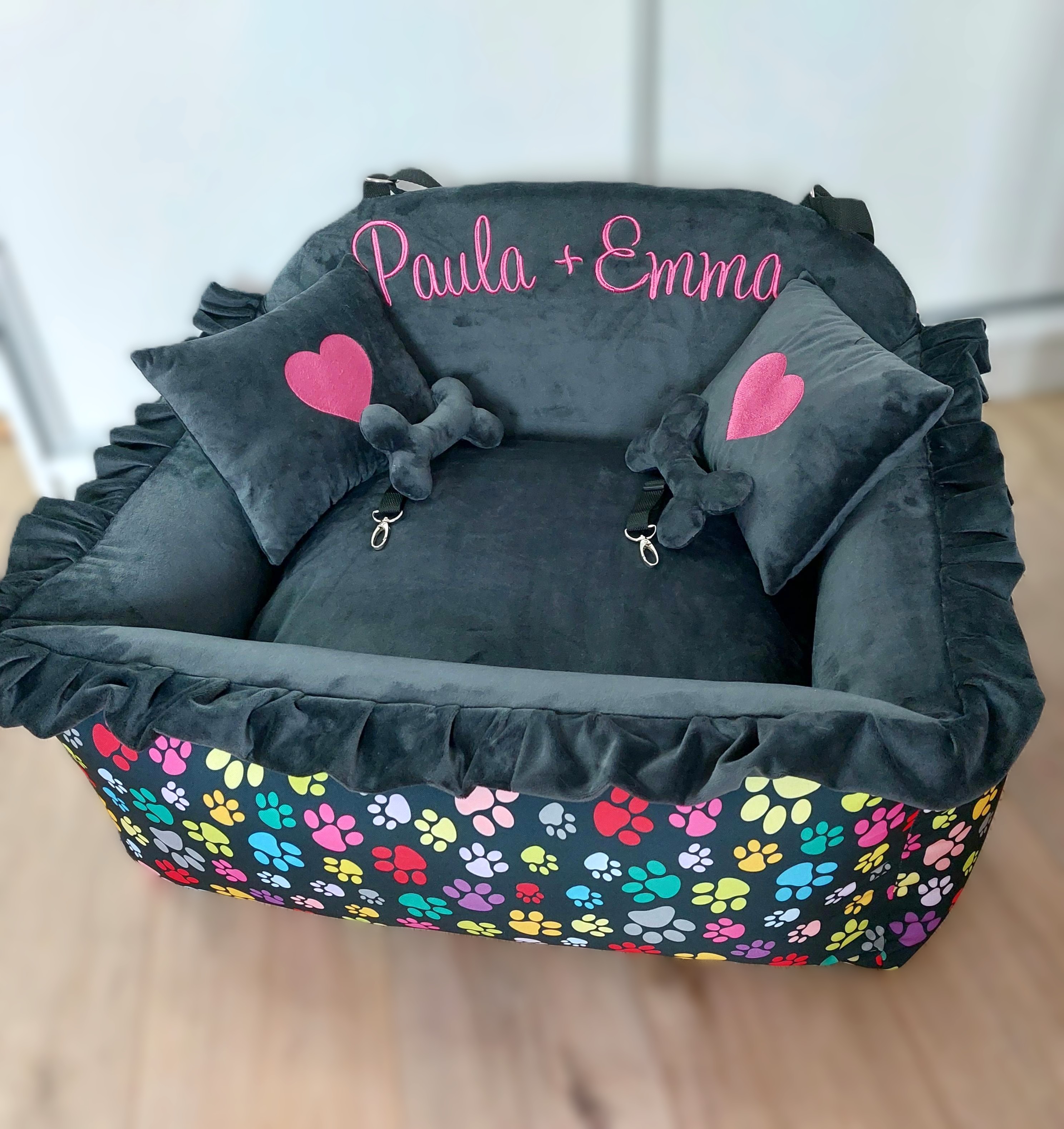 Autosedačka pre 2 psov, v rozmere 70 cm x 55 cm, tmavošedá v kombinácii s labkami. Obojstranný vankúš, z jednej strany chladivý, z druhej hrejivý. 2 vankúše, ružová víšivka. Autosedačka je s volánom. Cestuje do Nemecka, ďakujeme.