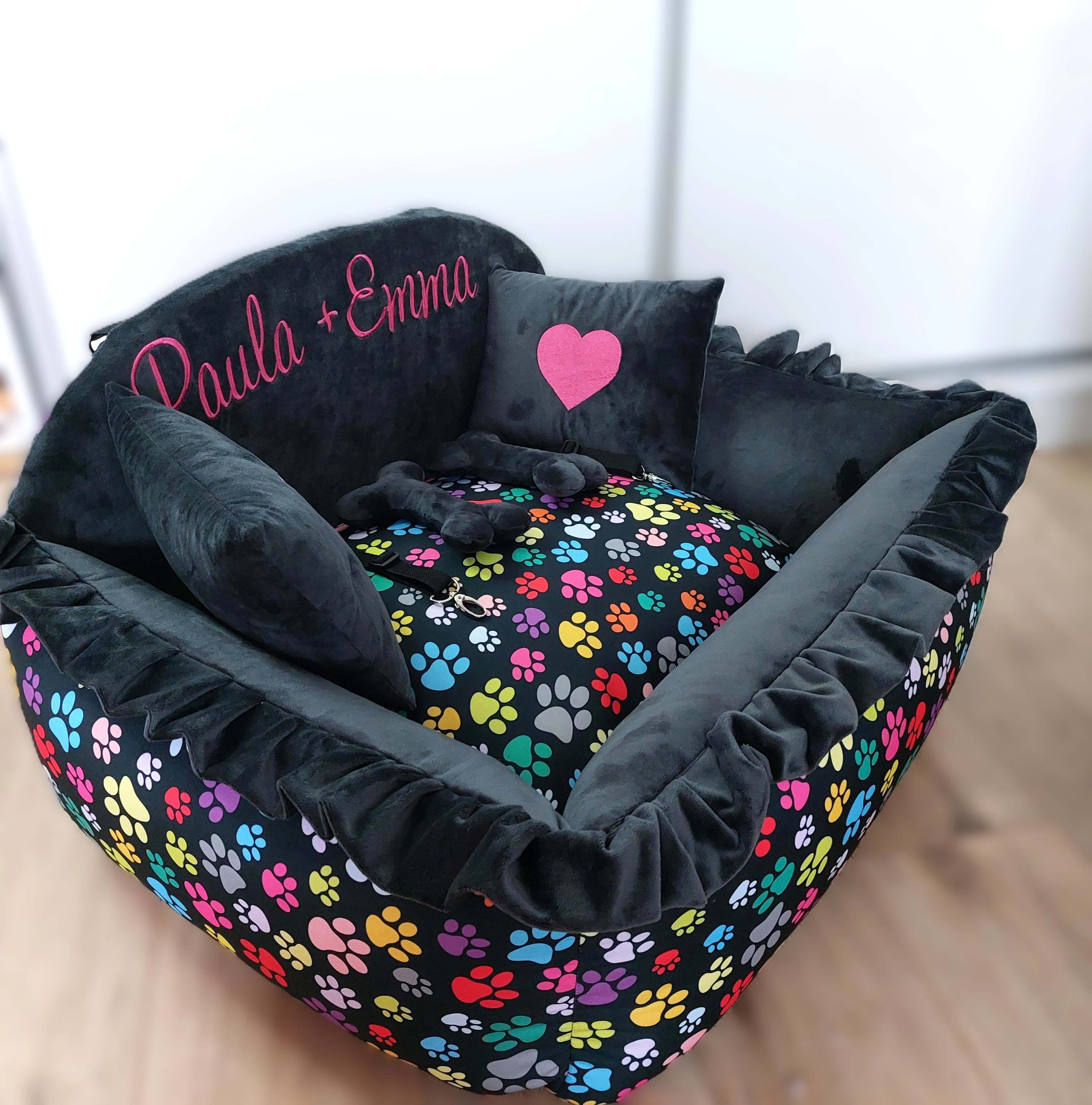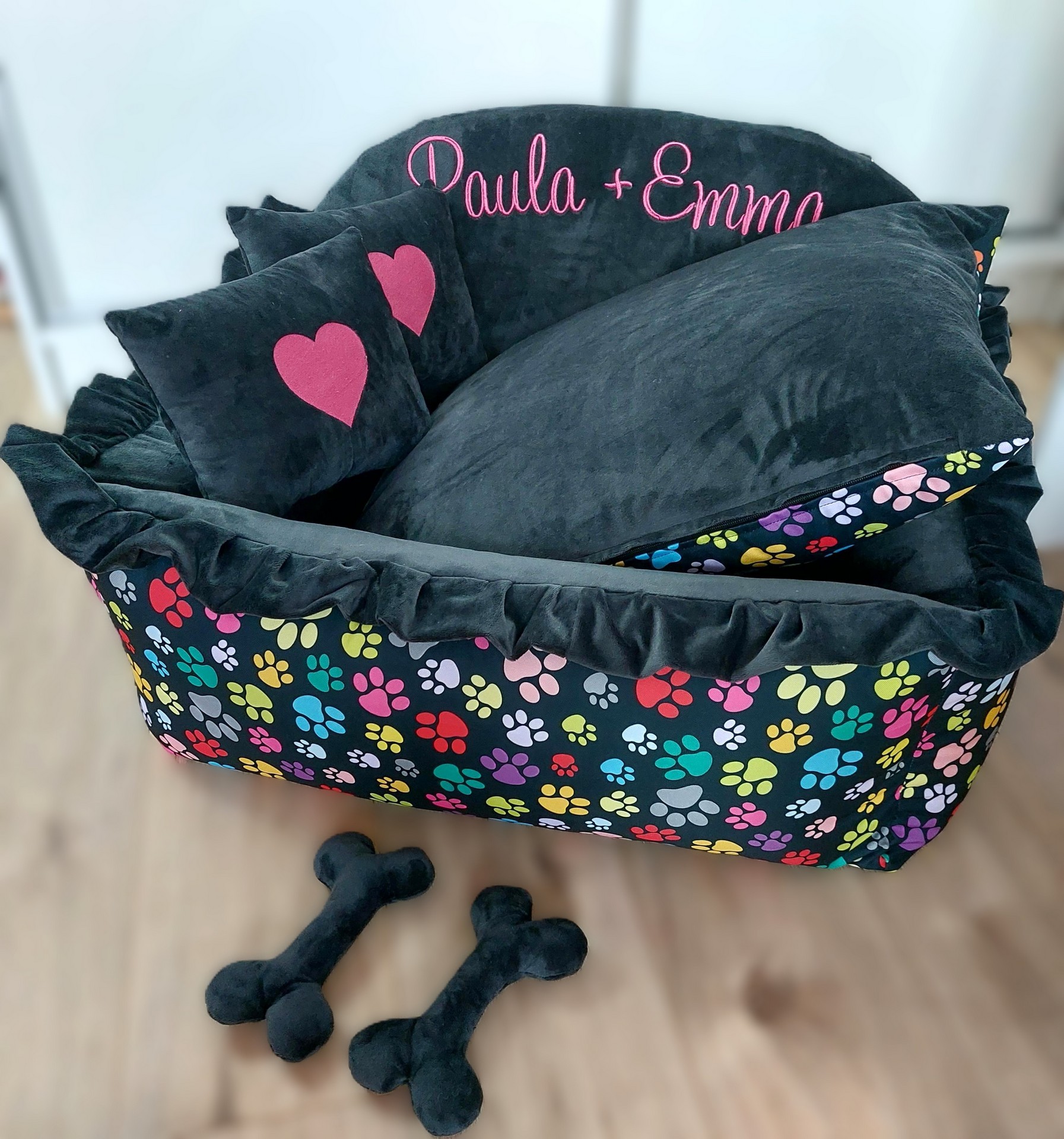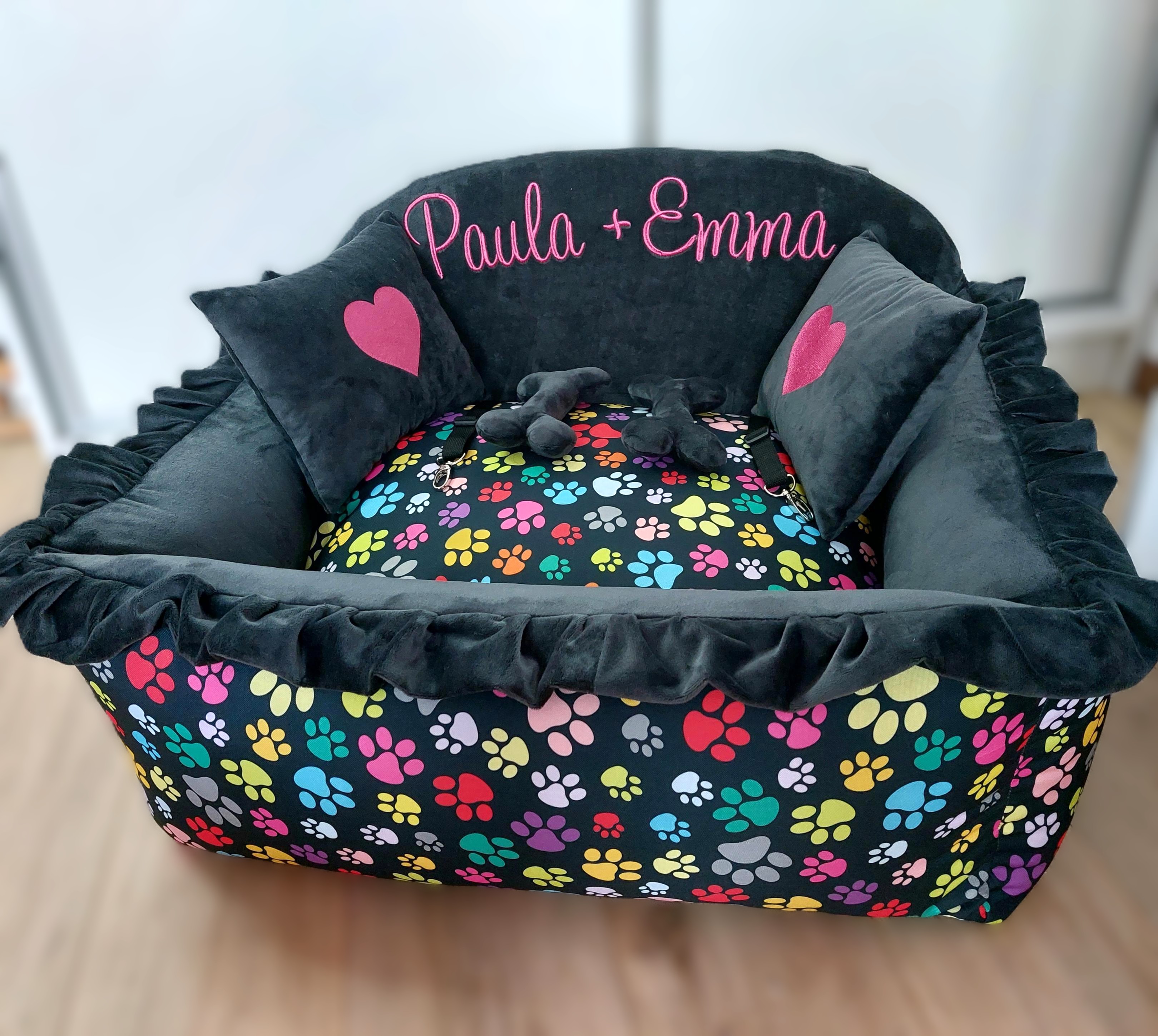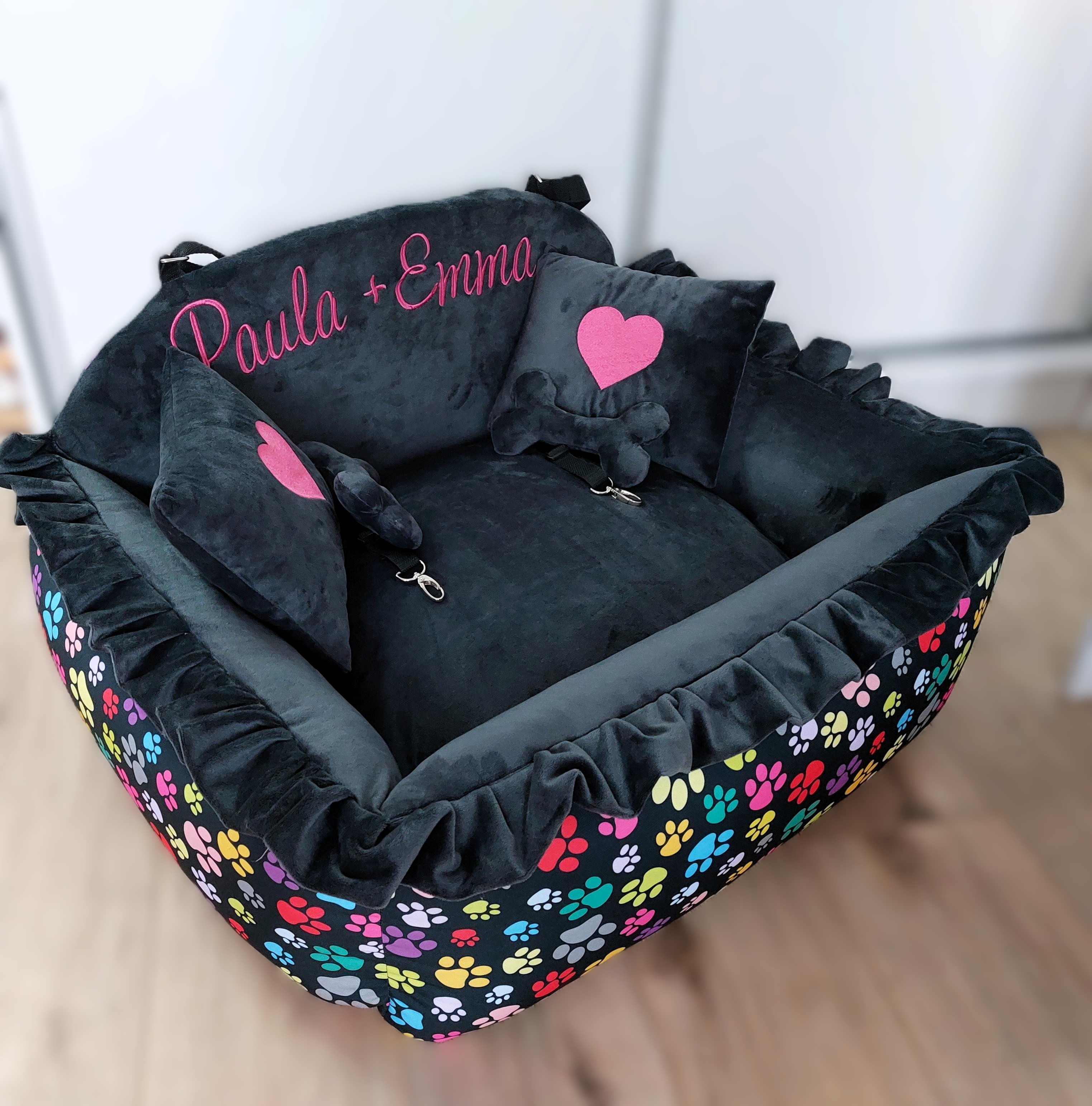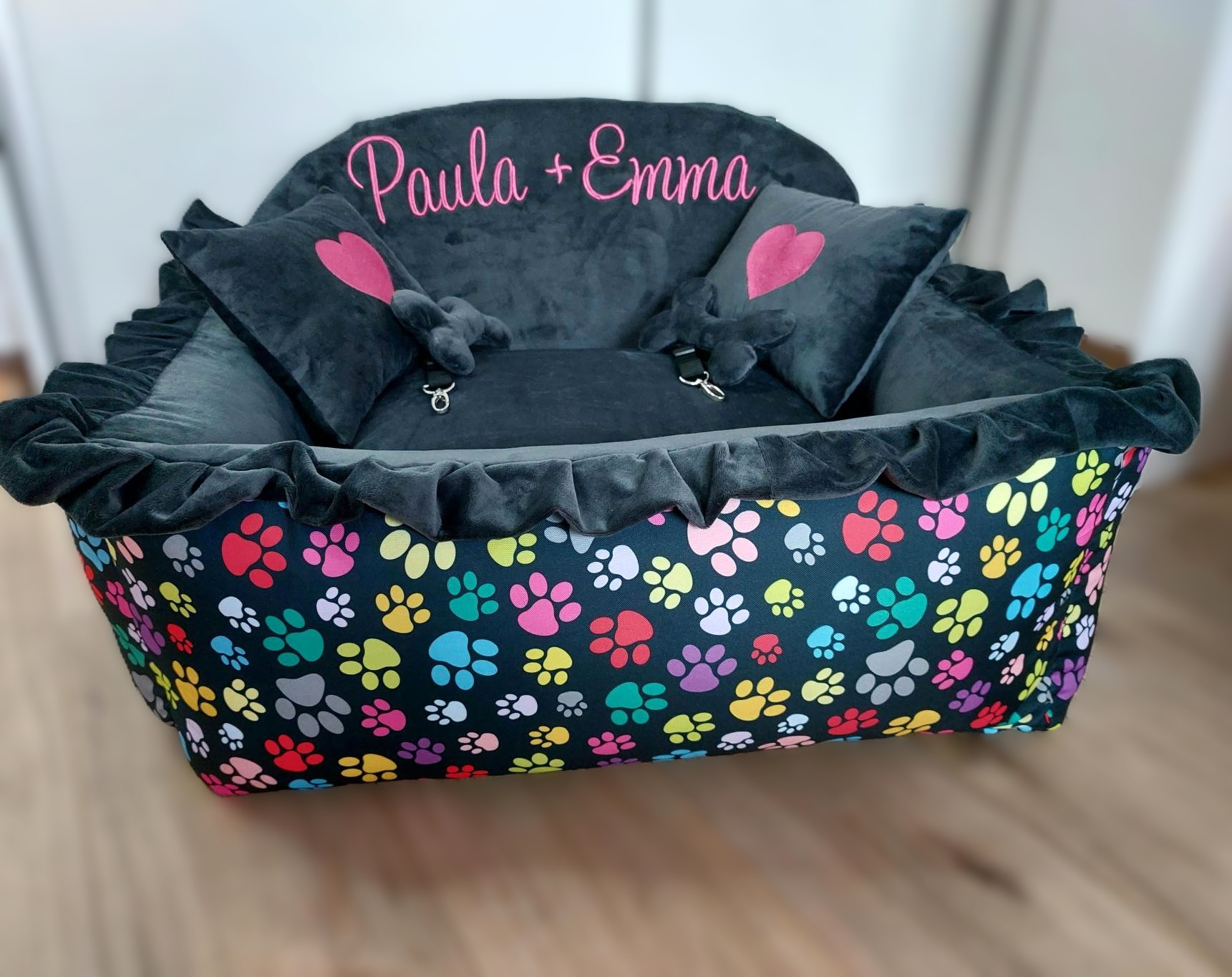 Autosedačka pre 2 psov, v rozmere 70 cm x 55 cm, tmavošedá v kombinácii s labkami. Obojstranný vankúš, z jednej strany chladivý, z druhej hrejivý. 2 vankúše, ružová víšivka. Autosedačka je s volánom. Cestuje do Nemecka, ďakujeme.