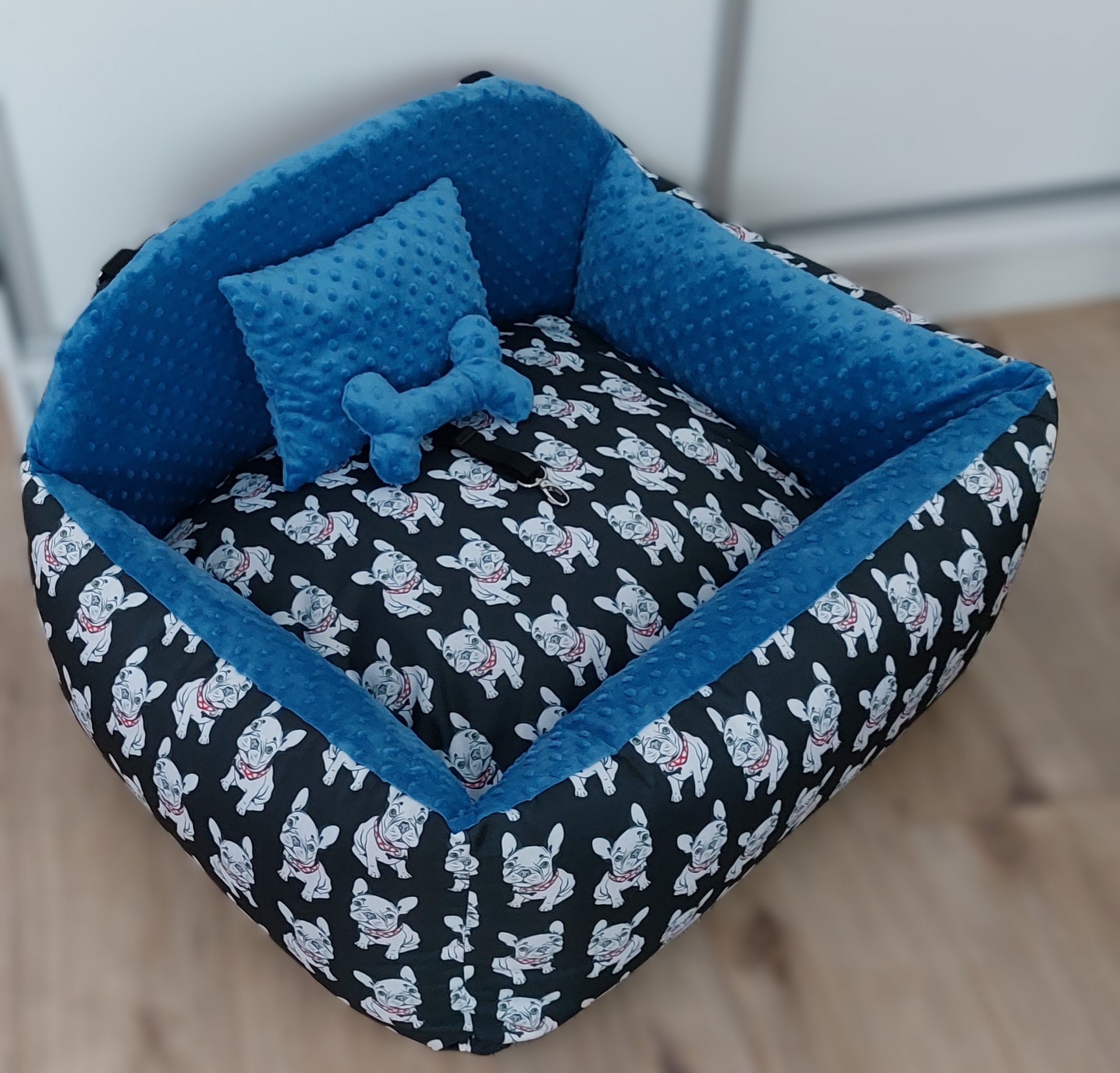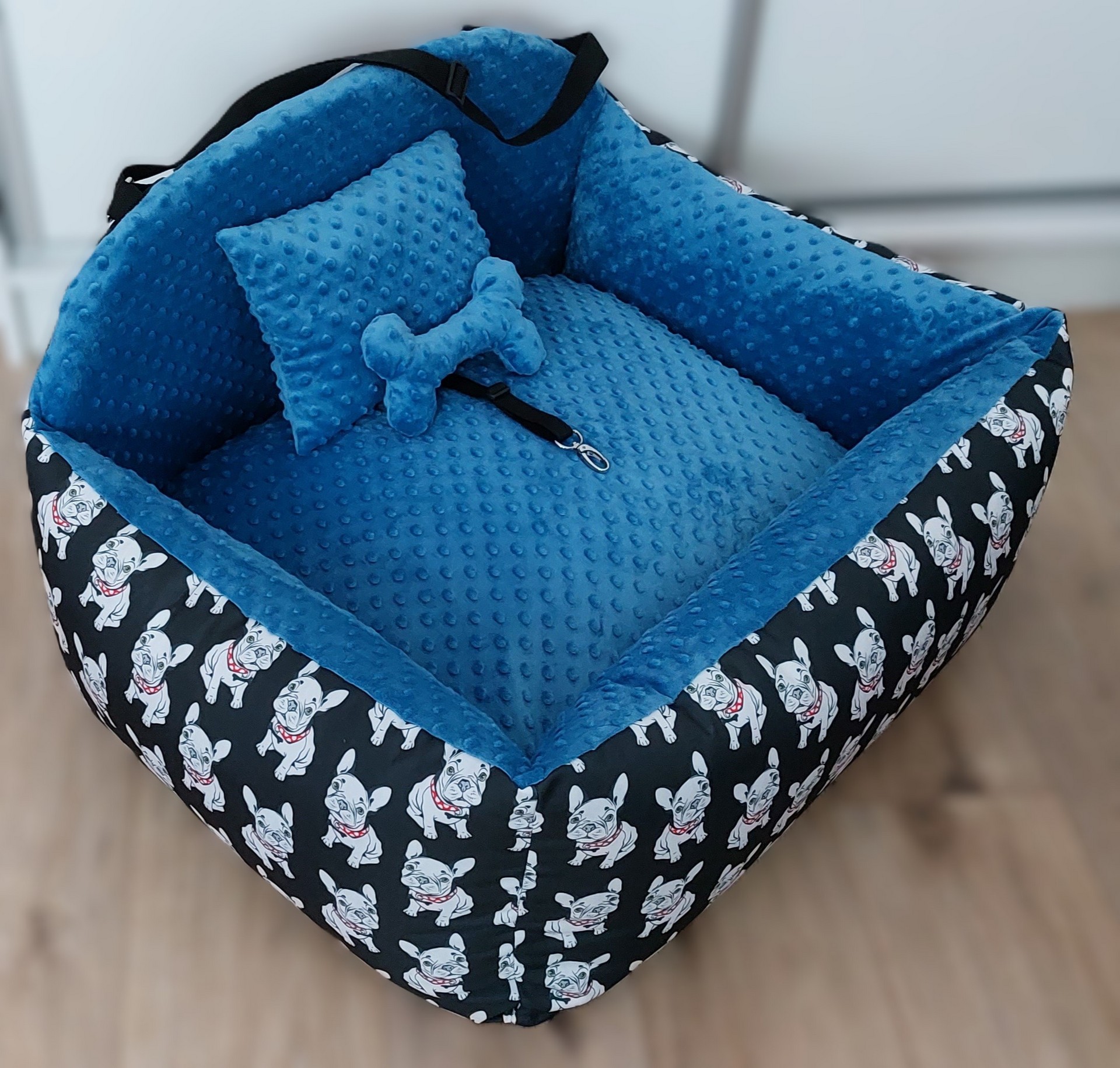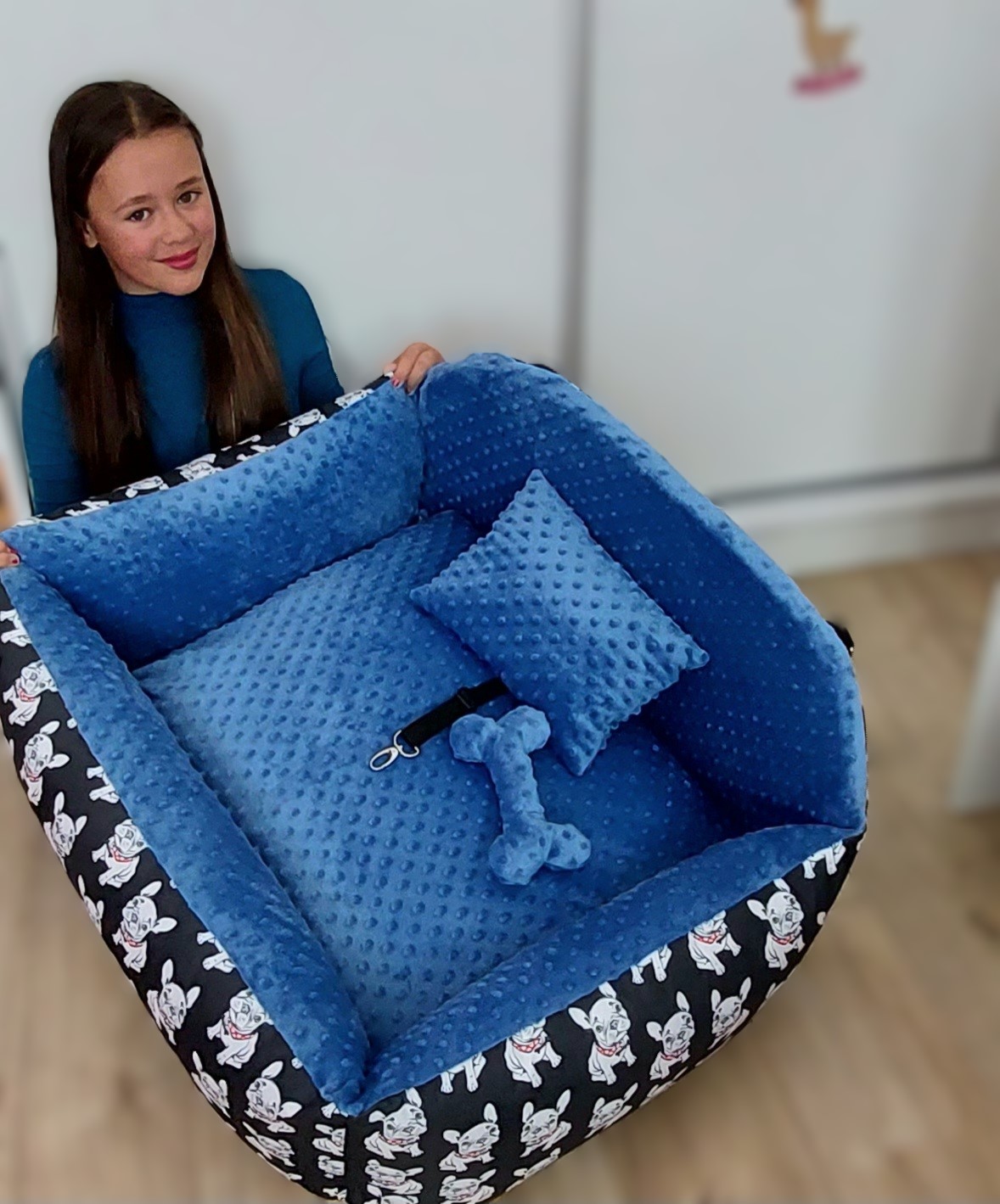 Buldočková autosedačka aj s modelkou /modelku neposielam/. Veľká pohodlná autosedačka 70x55cm. Krásna modrá kombinácia, samozrejme obojstranný vankúšik chladivý, aj hrejivý zamatový. Všetko na zips, celý poťah viete oprať. Ďakujem.