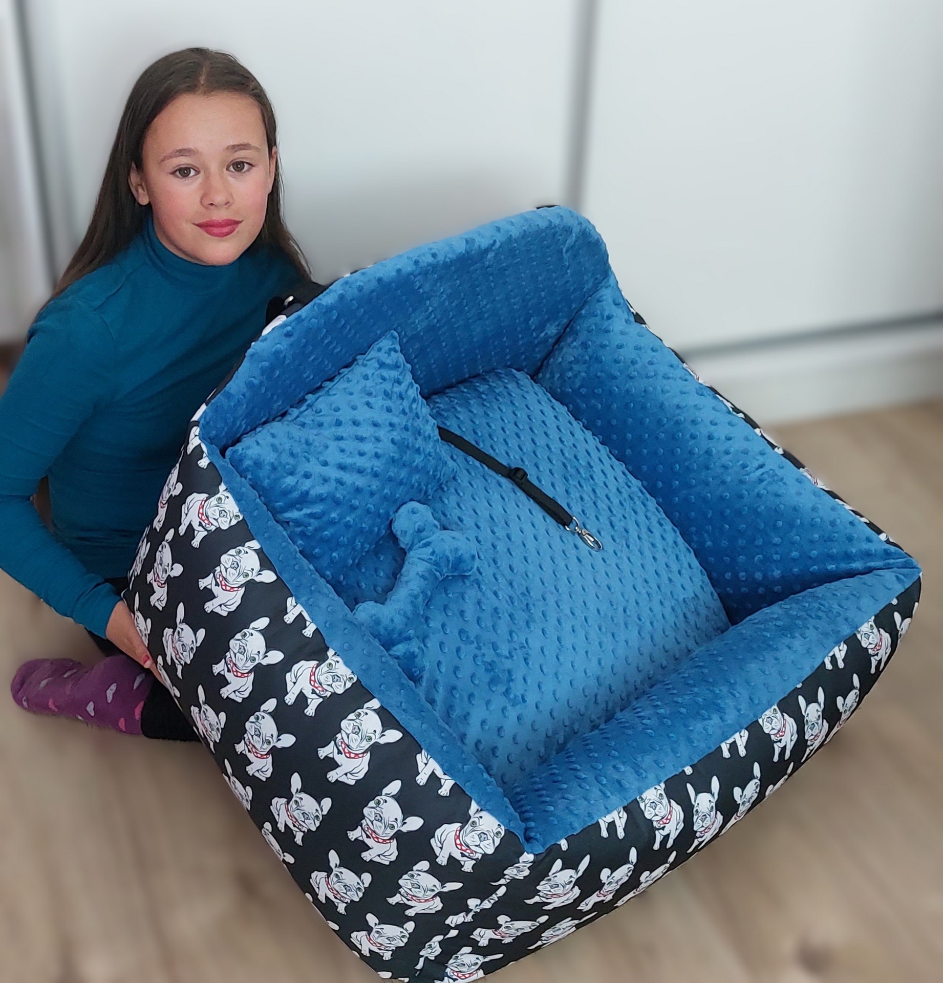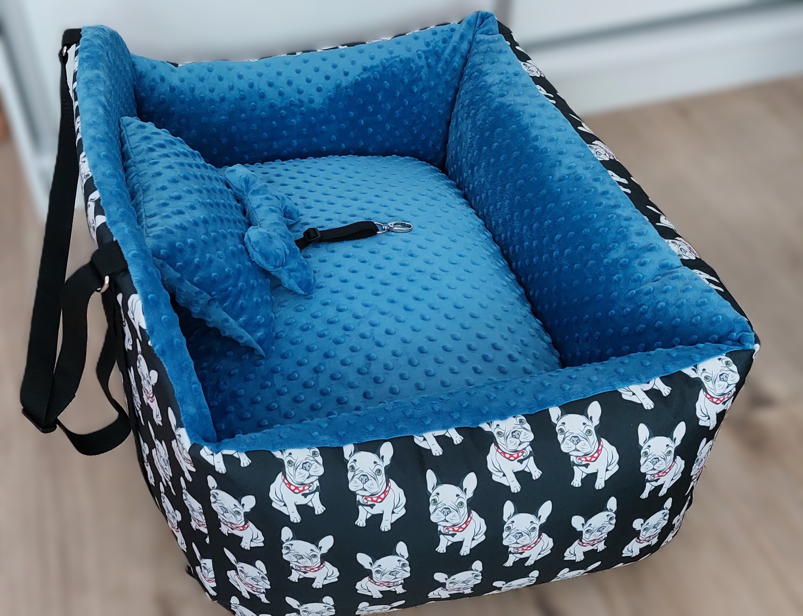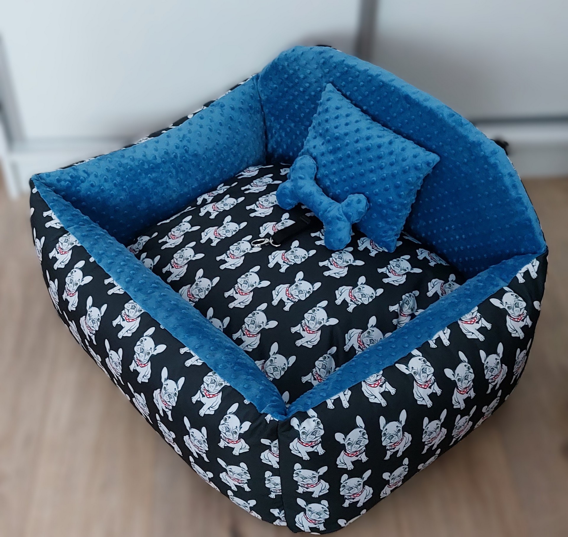 Buldočková autosedačka aj s modelkou /modelku neposielam/. Veľká pohodlná autosedačka 70x55cm. Krásna modrá kombinácia, samozrejme obojstranný vankúšik chladivý, aj hrejivý zamatový. Všetko na zips, celý poťah viete oprať. Ďakujem.