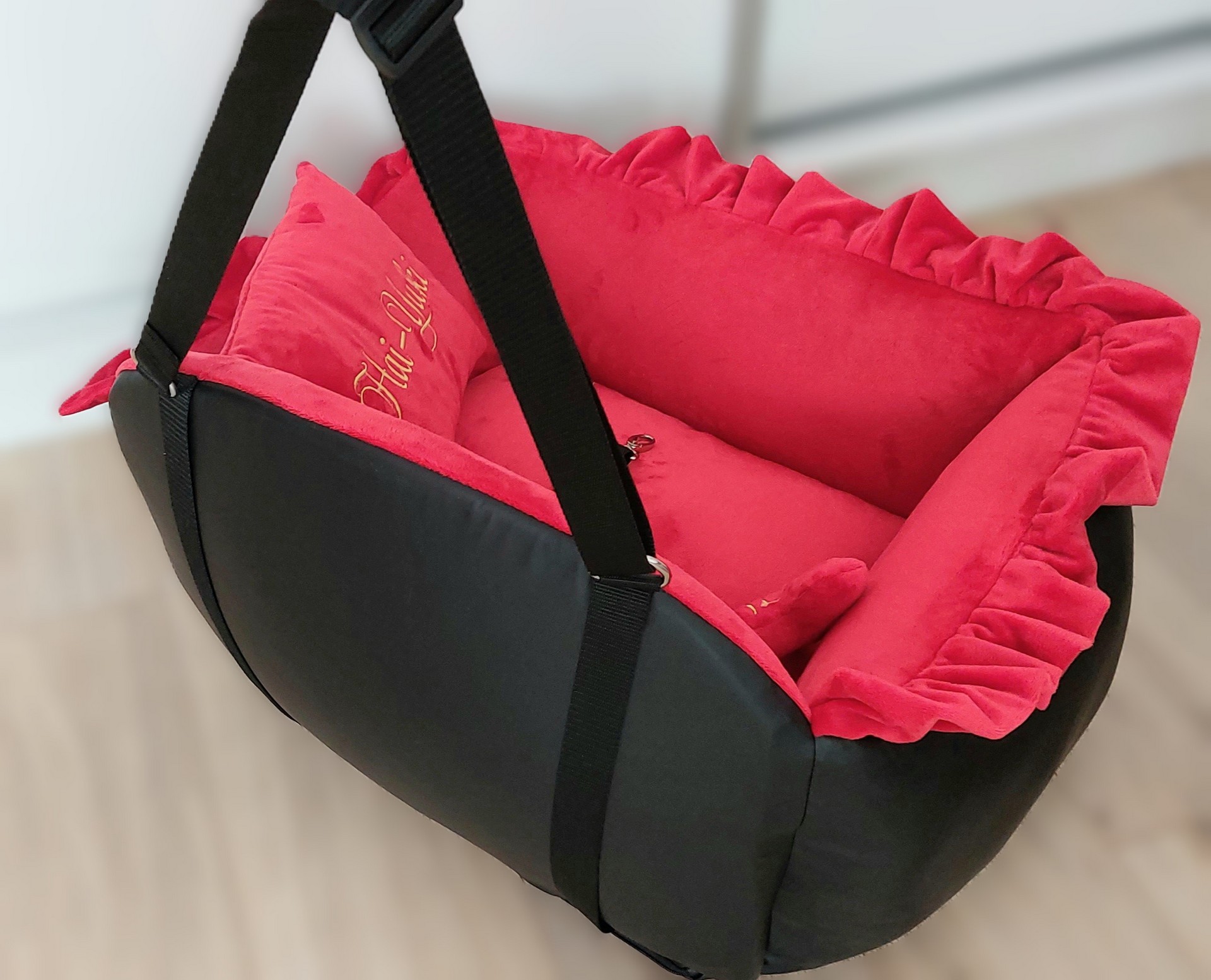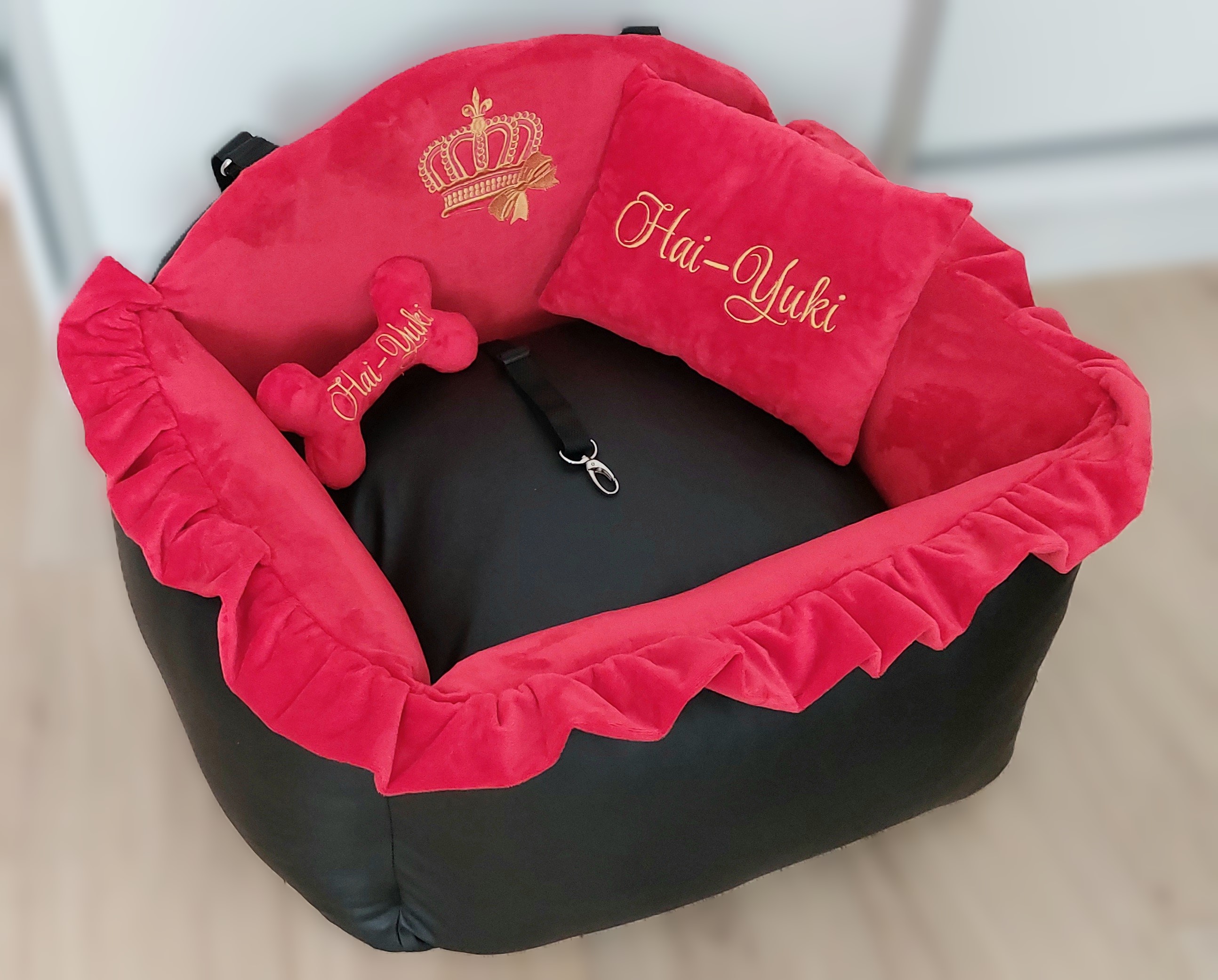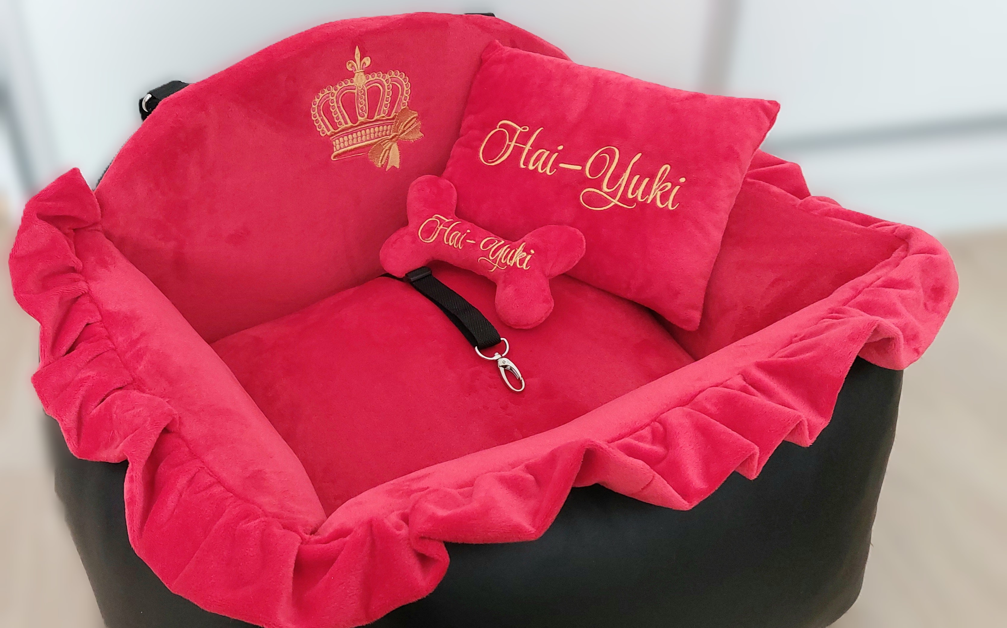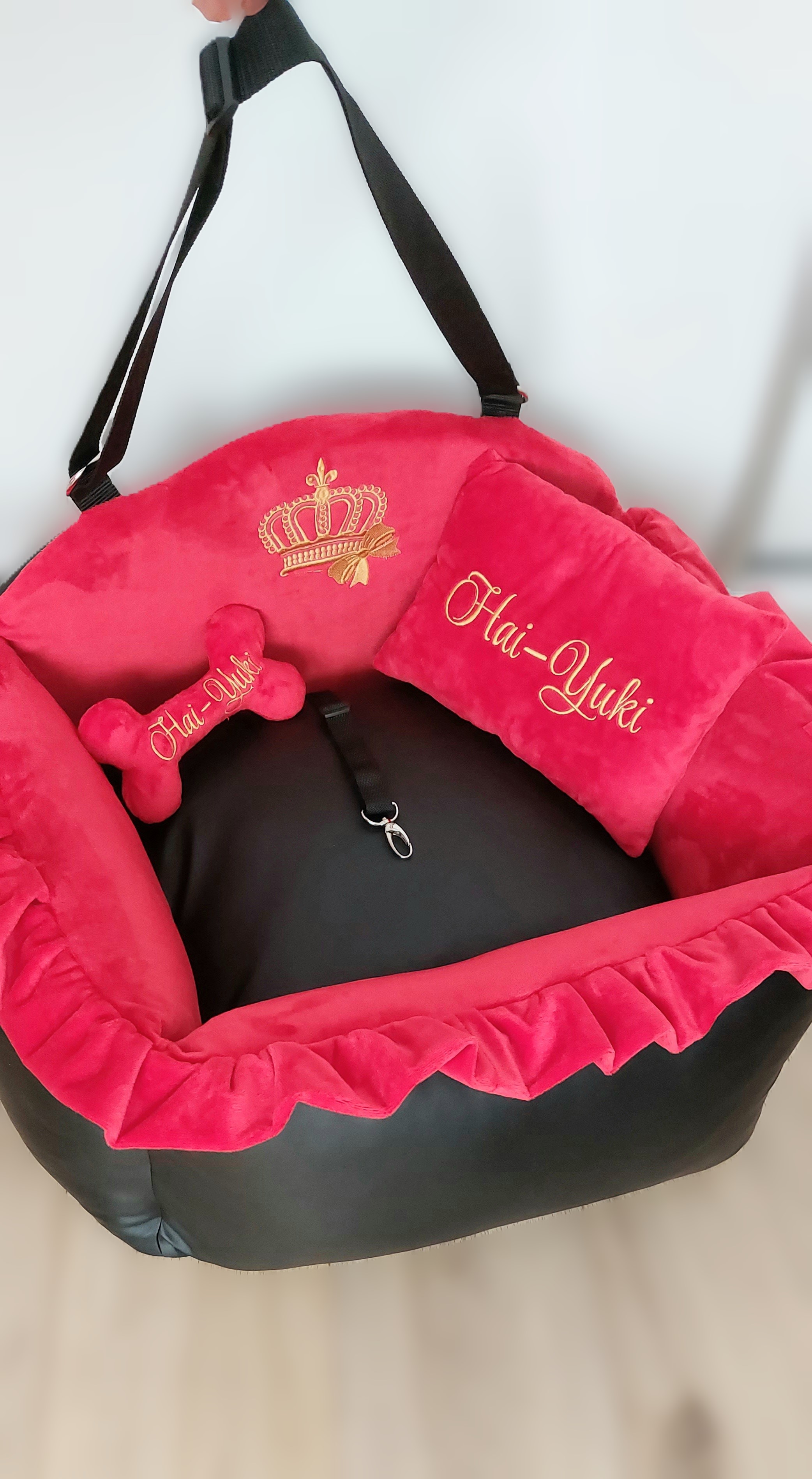 Koženkovo zamatová autosedačka pre Hai-Yuki, v rozmere 50x40cm. Vyšívaná zlatou niťou.