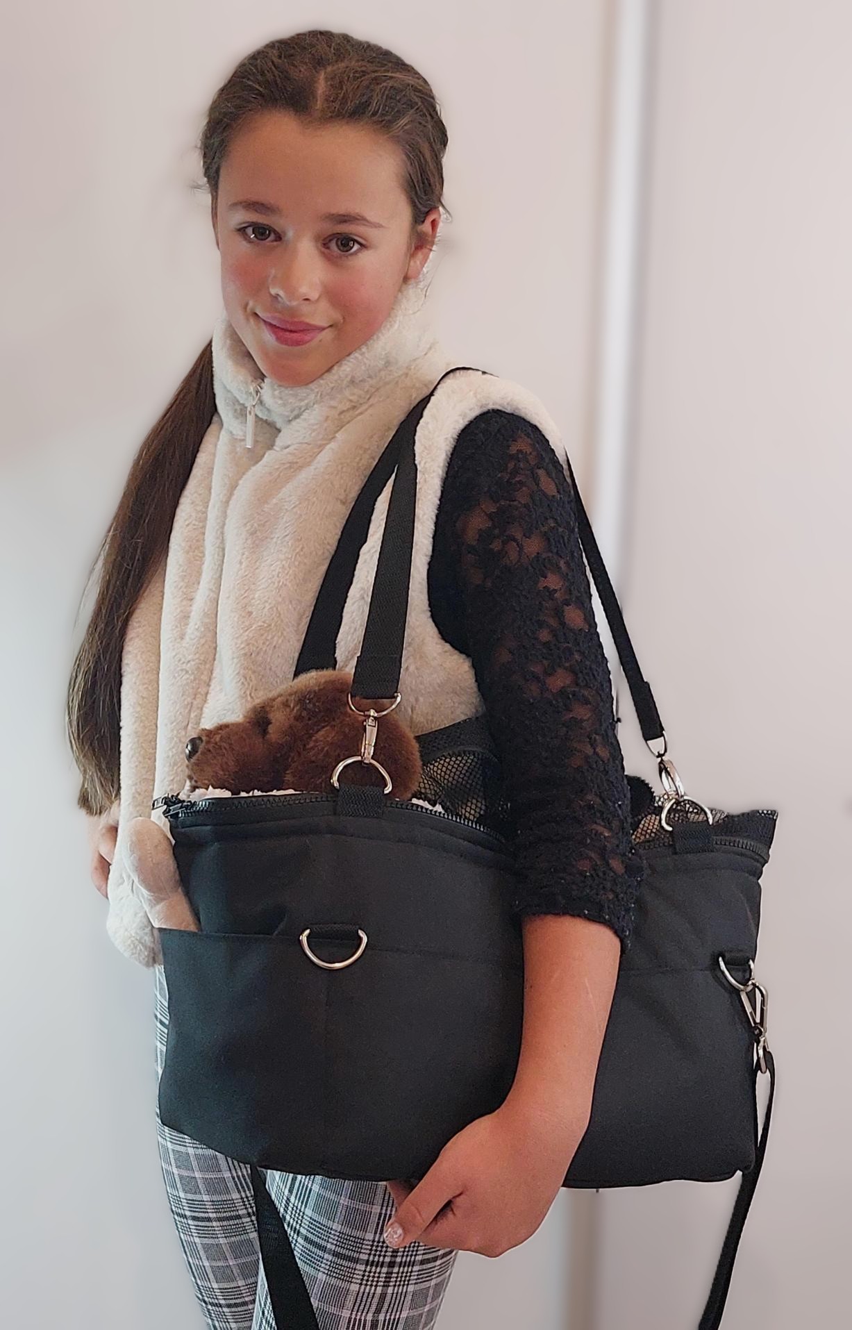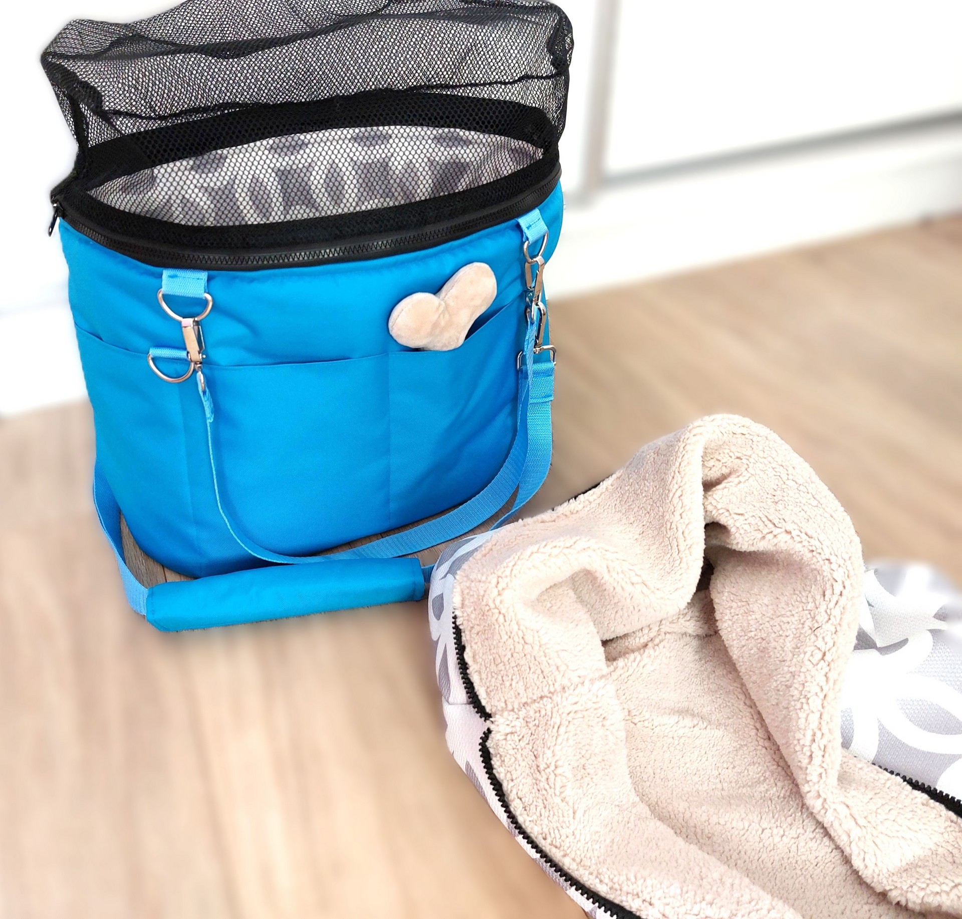 Čo by váš psík povedal, keby mohol hovoriť? Pravdepodobne niečo ako: 'Kde bola táto taška celý môj život?!' Naša cestovná taška dark azzure s béžovou kožušinou je ideálna na všetko – od lietadla po reštauráciu, a dokonca aj ako pohodlný pelech. S vreckam...