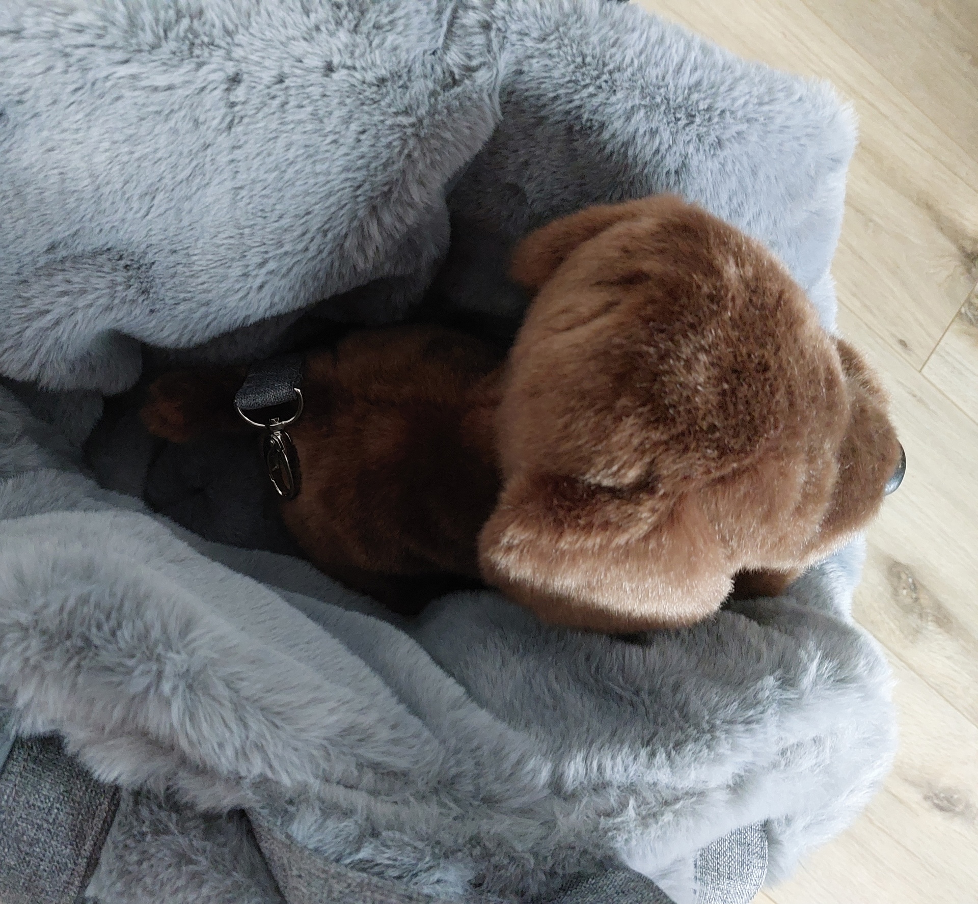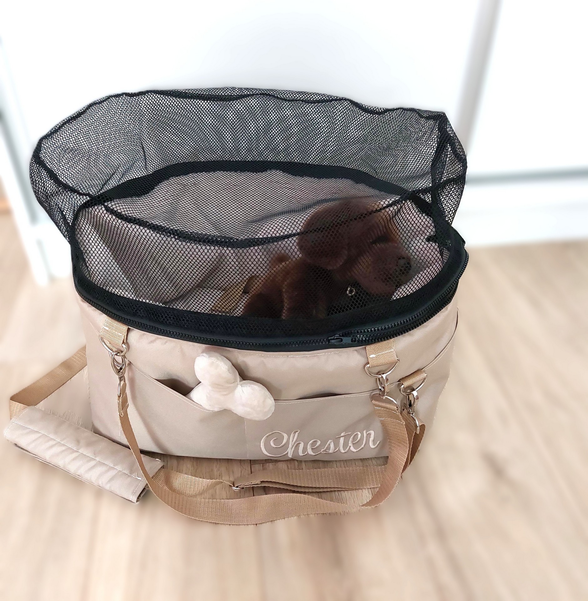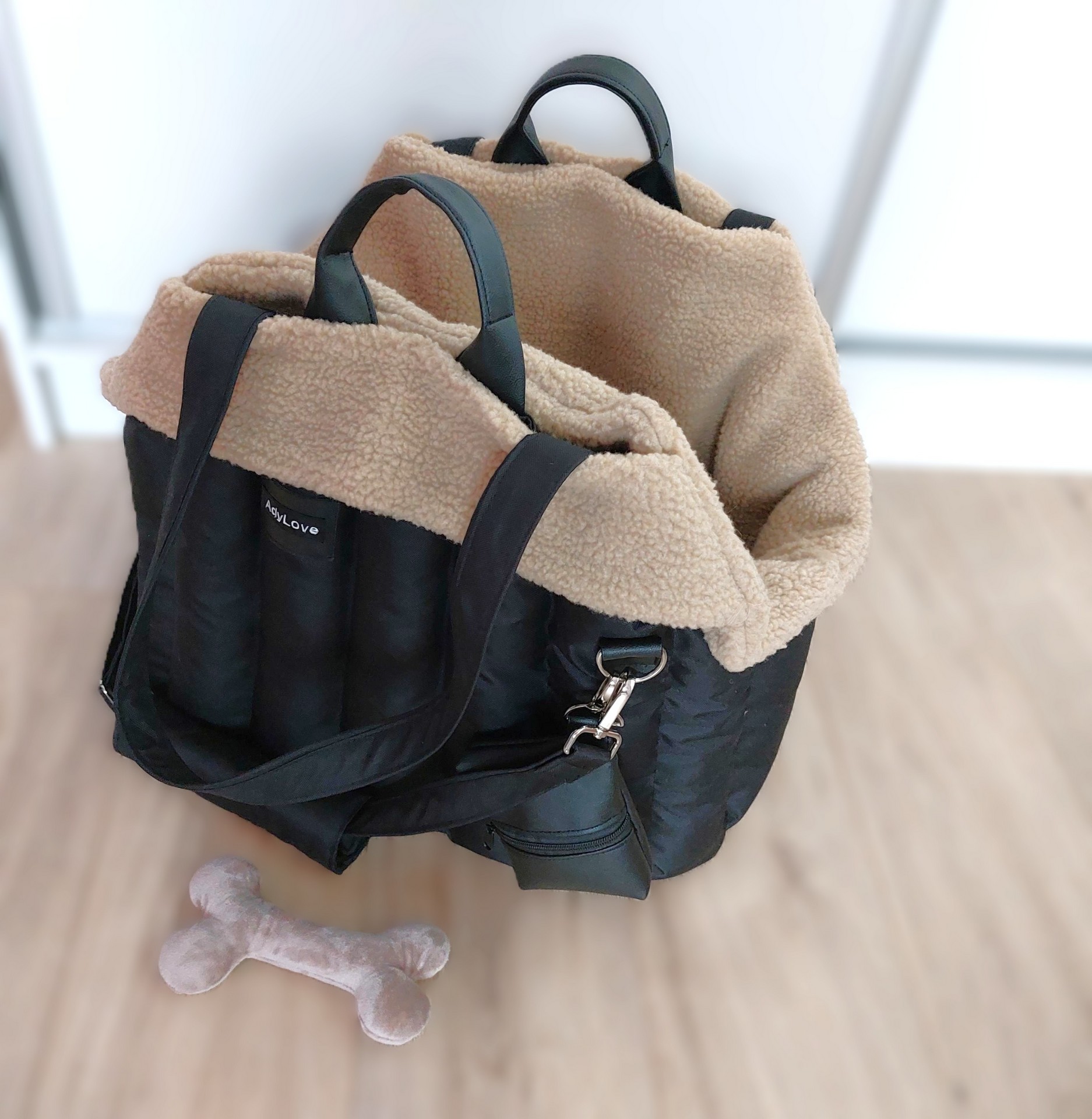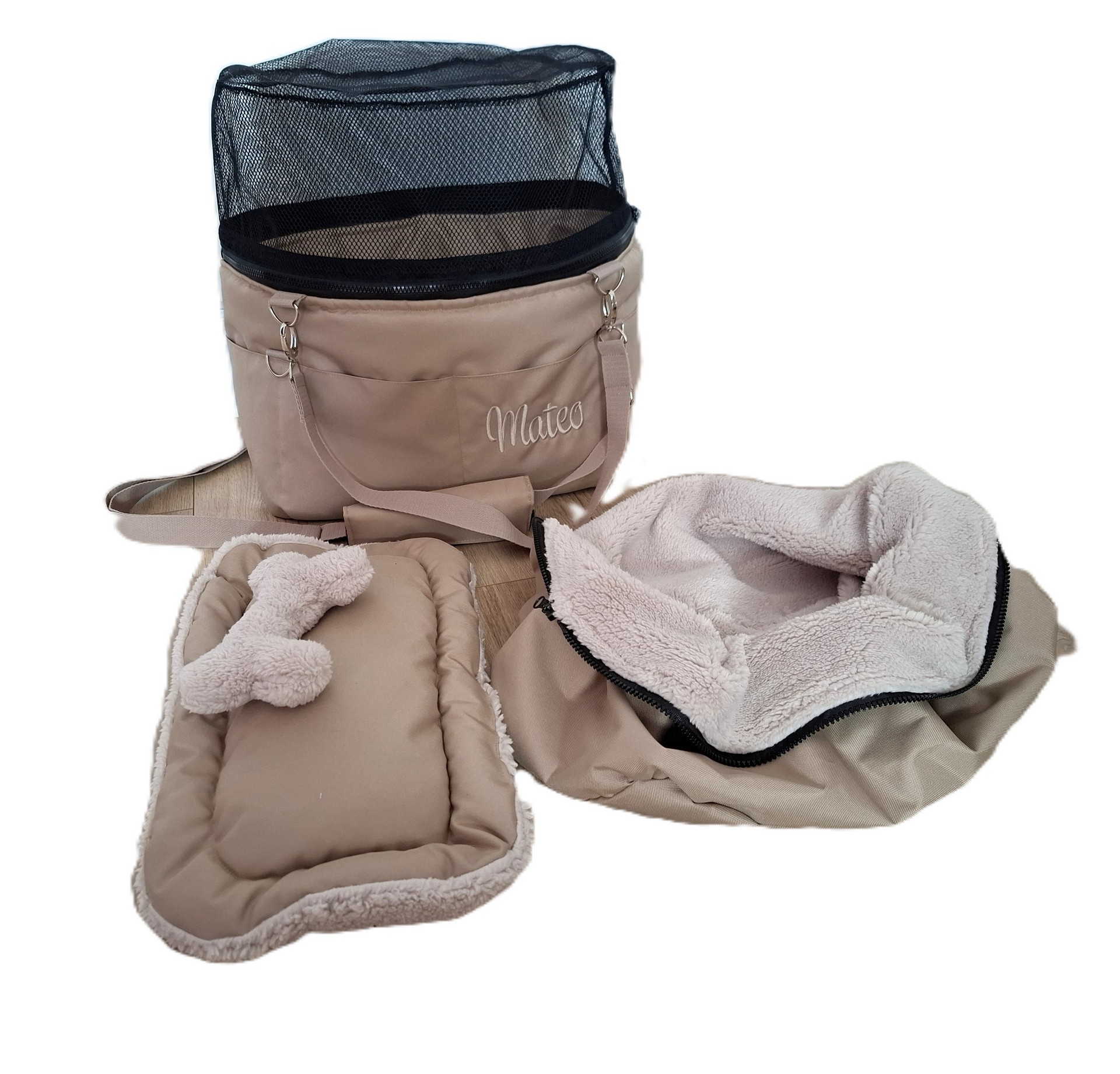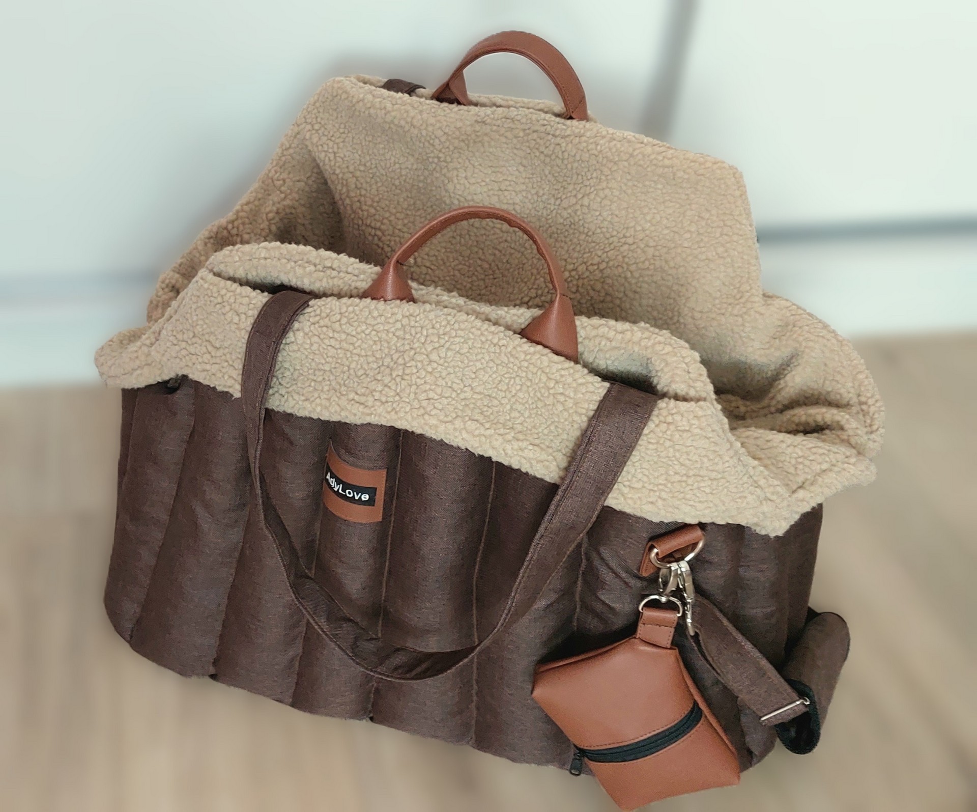 Taška pre ich nového psíka je veľká 60x35cm, s kozušinkami v bežovej a hnedej farbe.