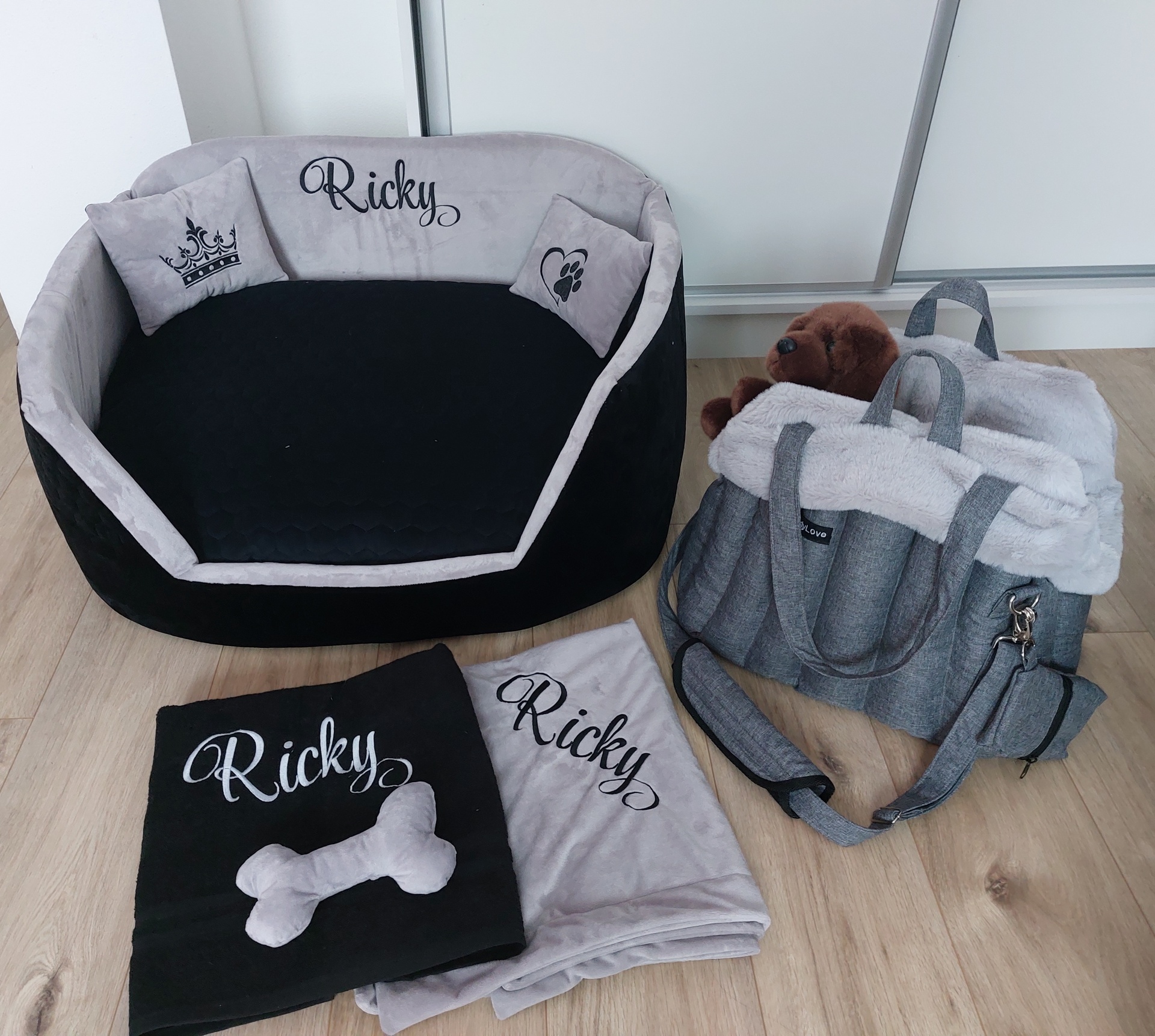 Súprava peliešok, prenosná taška, deka, uterák pre Rickyho, súprava autosedačka, šedá kožušinová deka a uterák pre Maxa, Dve čierne prenosné tašky 50x20cm a 30x20 cm s čiernou vyberateľnou kožušinkou. Súprava peliešok, prenosná taška, deka, uterák pre Ri...