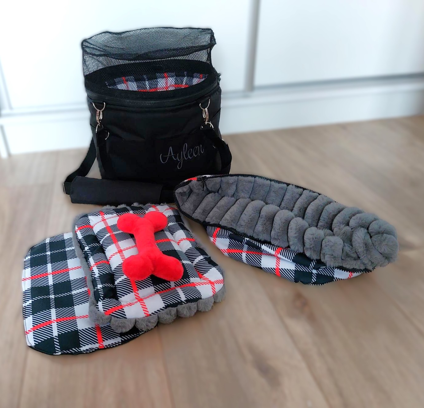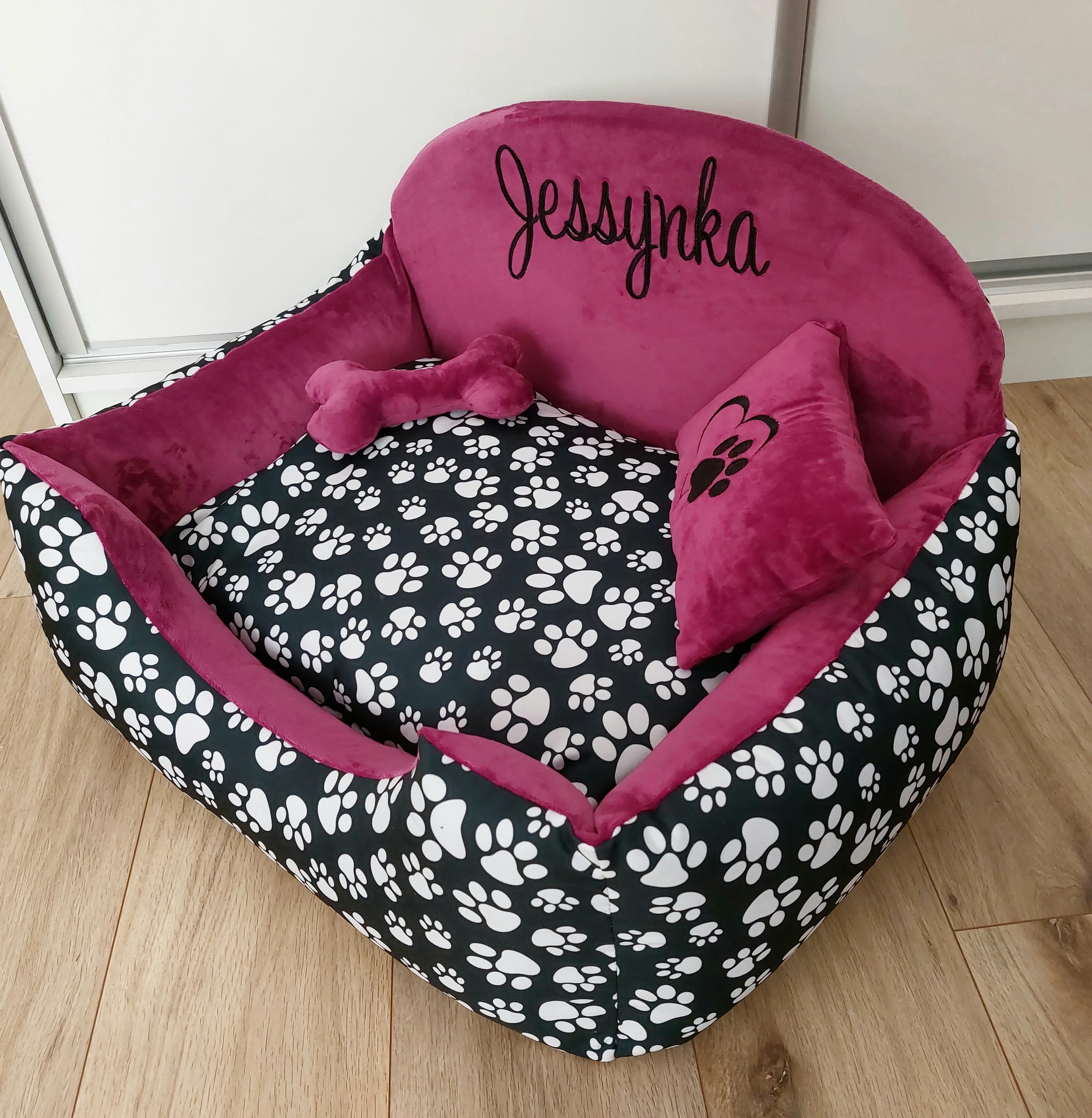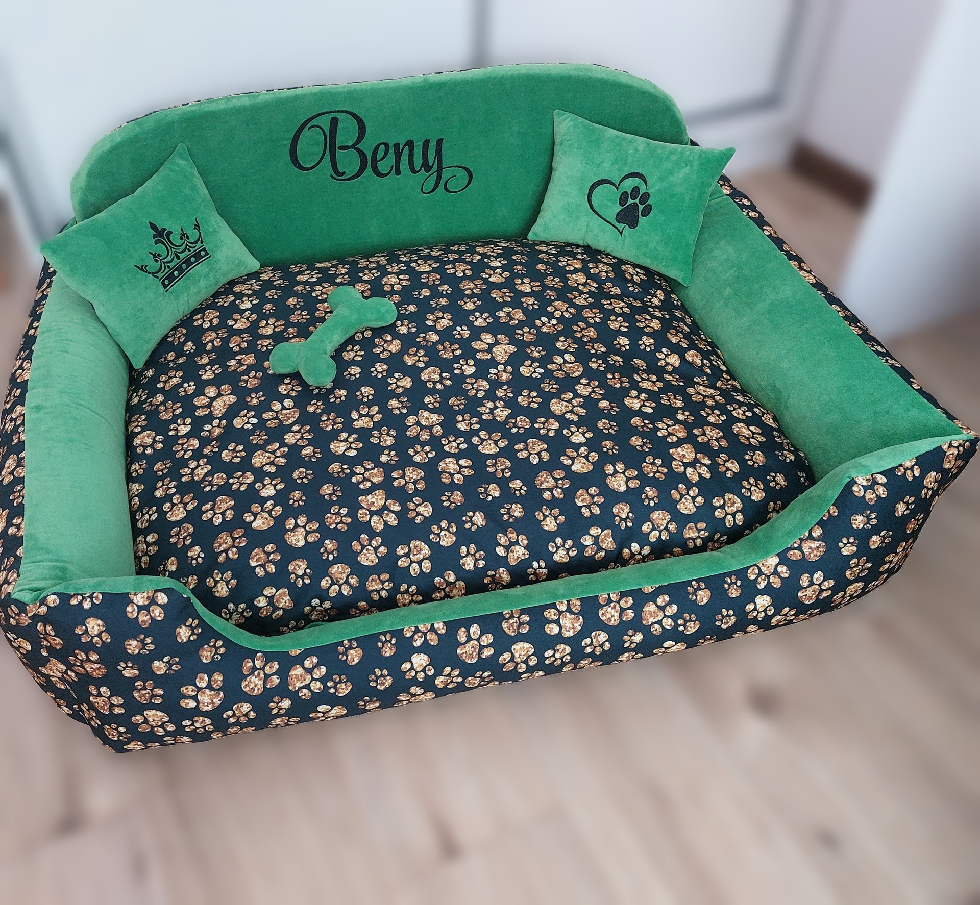 Na dnes pelech vo velkosti 100x80cm pre Benyho. Samozrejme obojstranny vankuš, z jednej strany hrejivy, z druhej chladivý. Výšivka mena na želanie. Dva vyšité vankúšiky, plus hračka kostička. Fotky od spokojného Benyho, ďakujeme