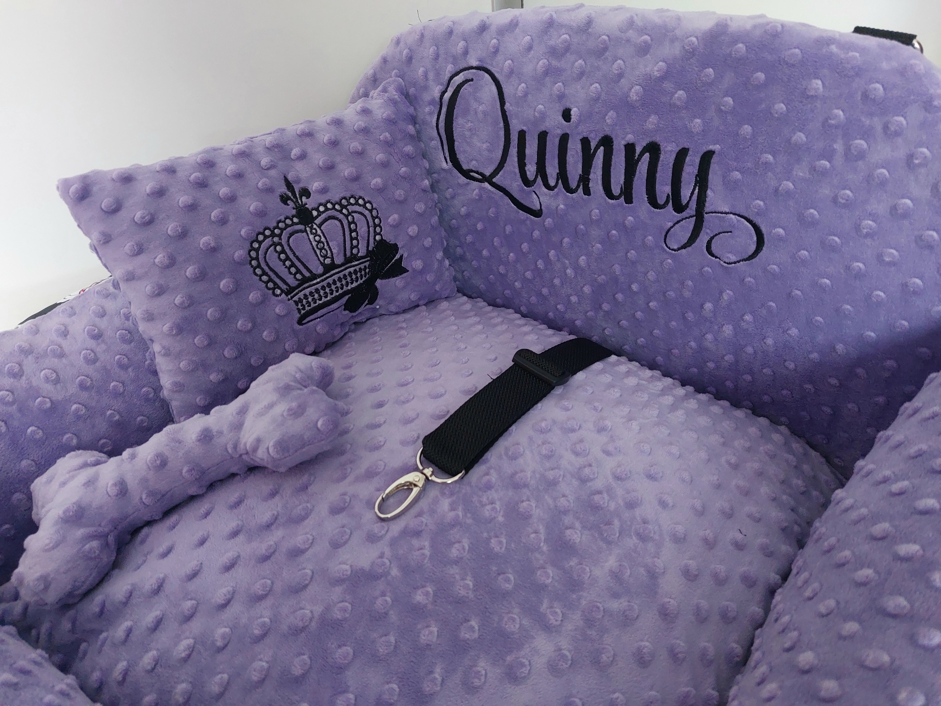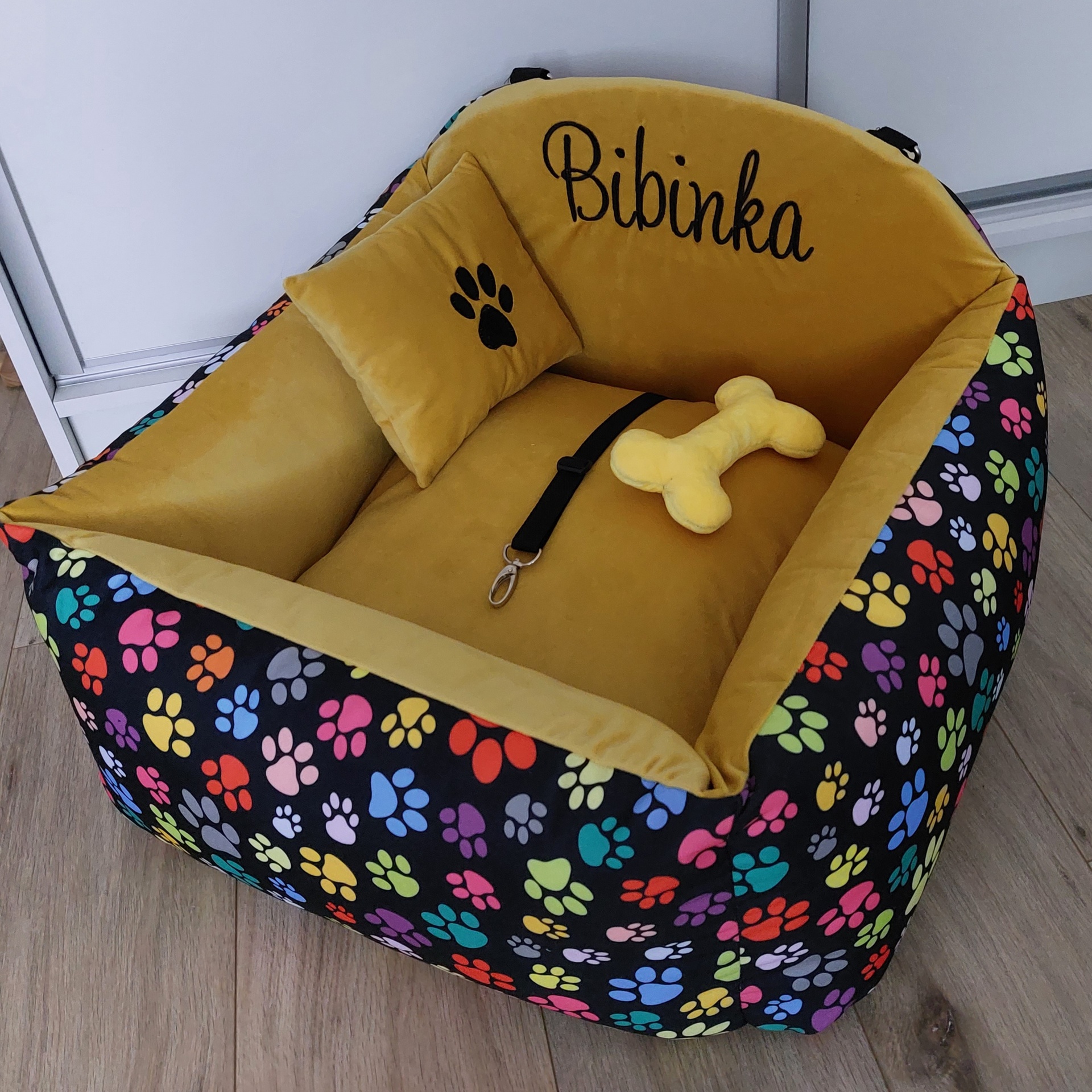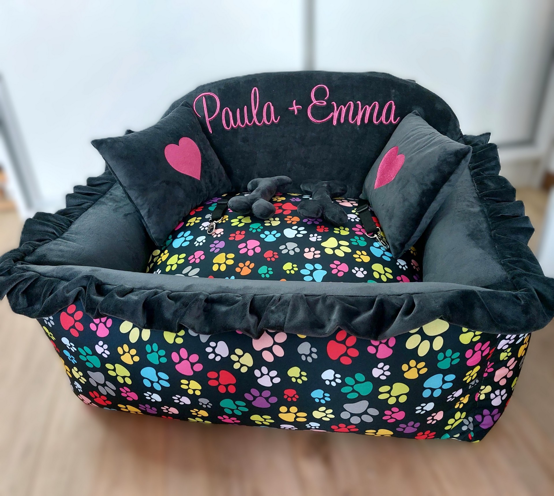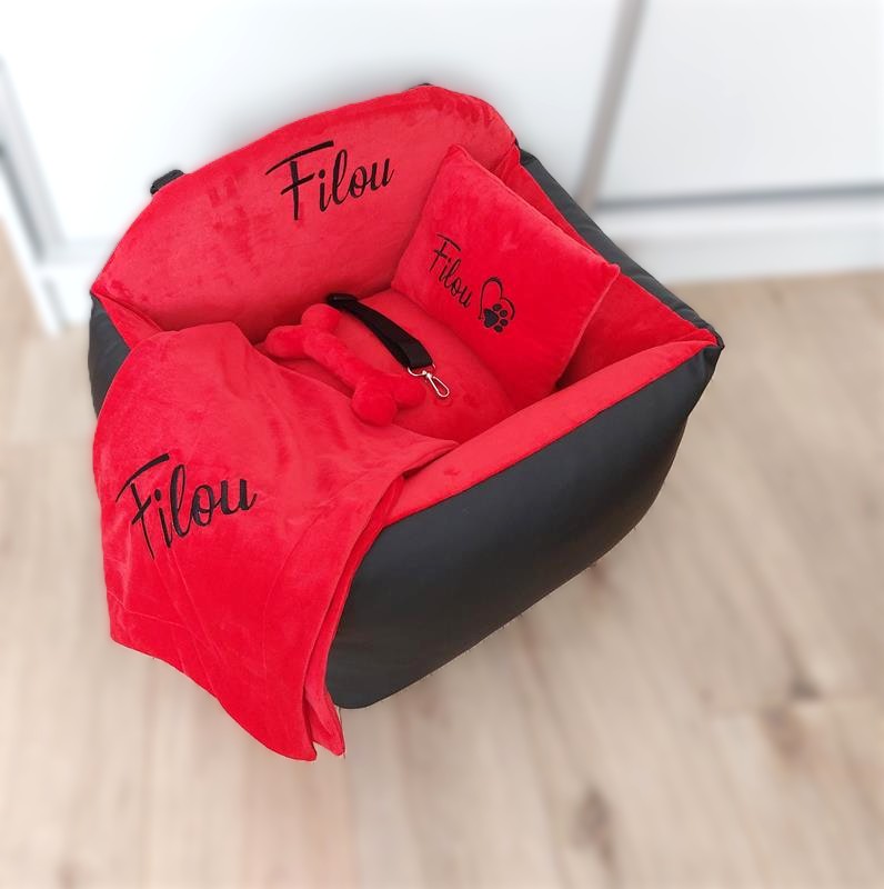 Autosedačka pre Tali v krásnej kombinácii s labkami . Rozmer 50 x 40 cm s vankúšom obojstrannym, na leto chladivým, v zime príjemný zamatový.