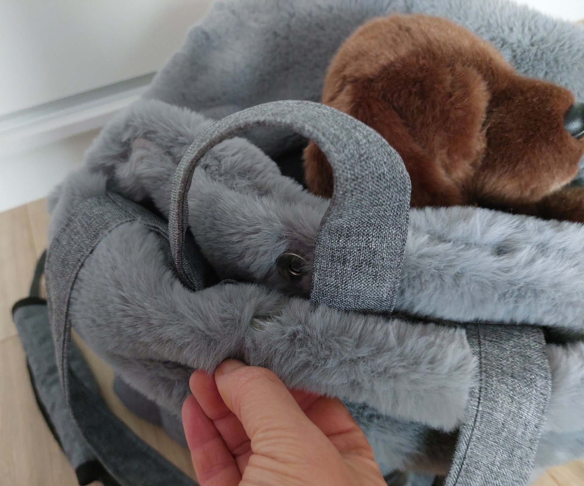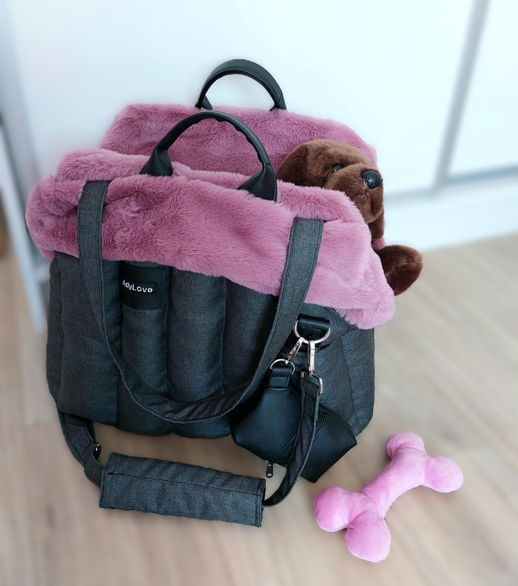 Prenosná taška rozmer 45 x 20 cm, farba antracit s ružovou vyberateľnou kožušinou.