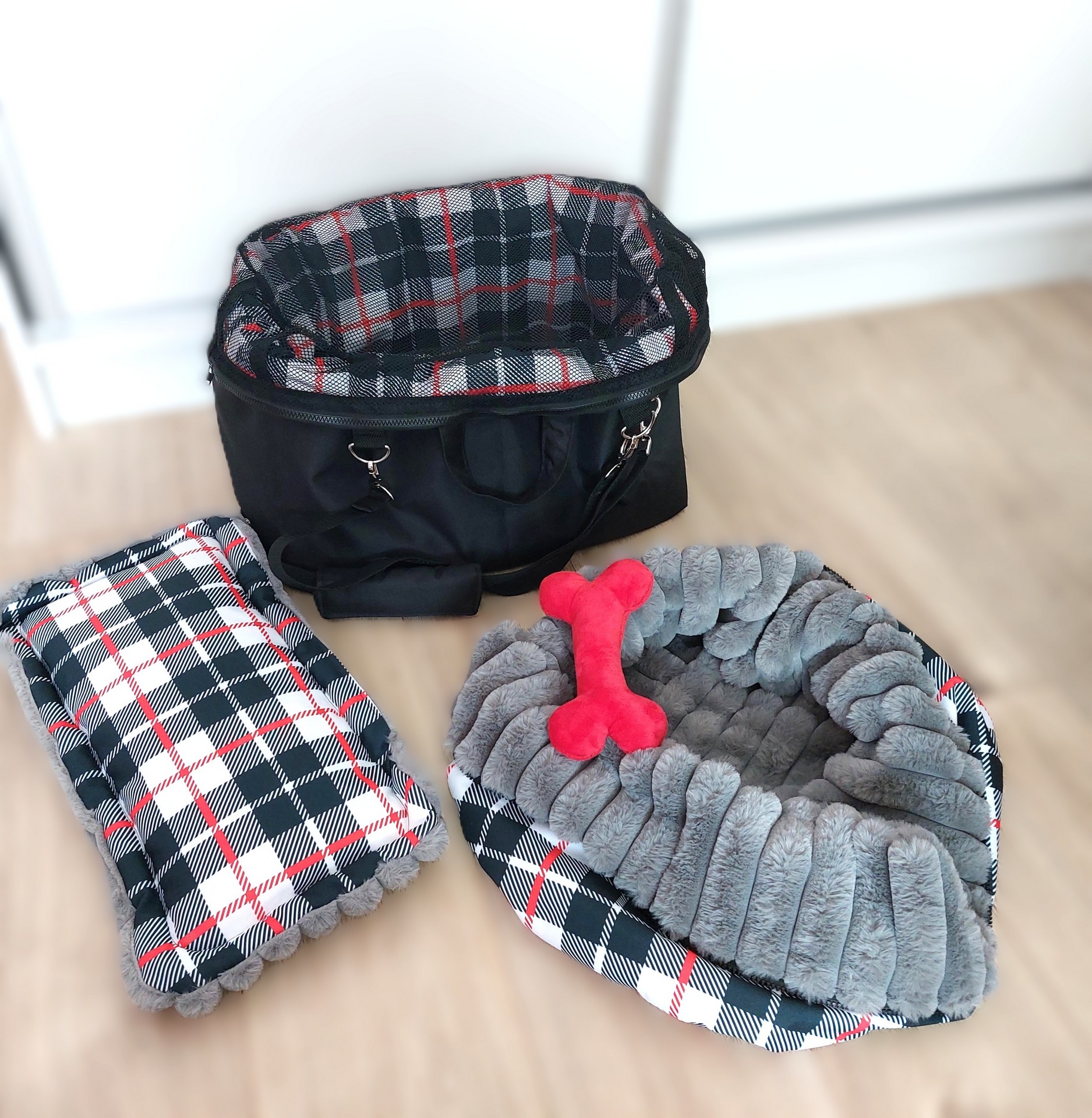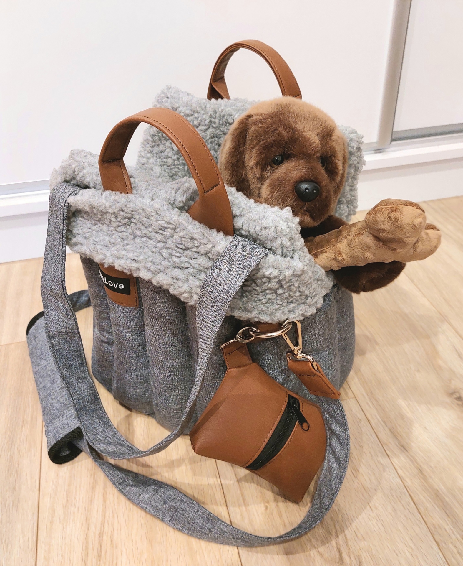 Prenosná taška 30 x 20 cm.Šedá vodeodolná látka s vyberateľnou šedou kožušinou imitácia ovca. Príslušenstvo : 3mm tvrdená podložka v látke, mäakký vyberateľný vankúš, popruh na uchytenie psíka, koženková taška na sáčky malá, mäkký doplnok na popruhy, 3 mo...