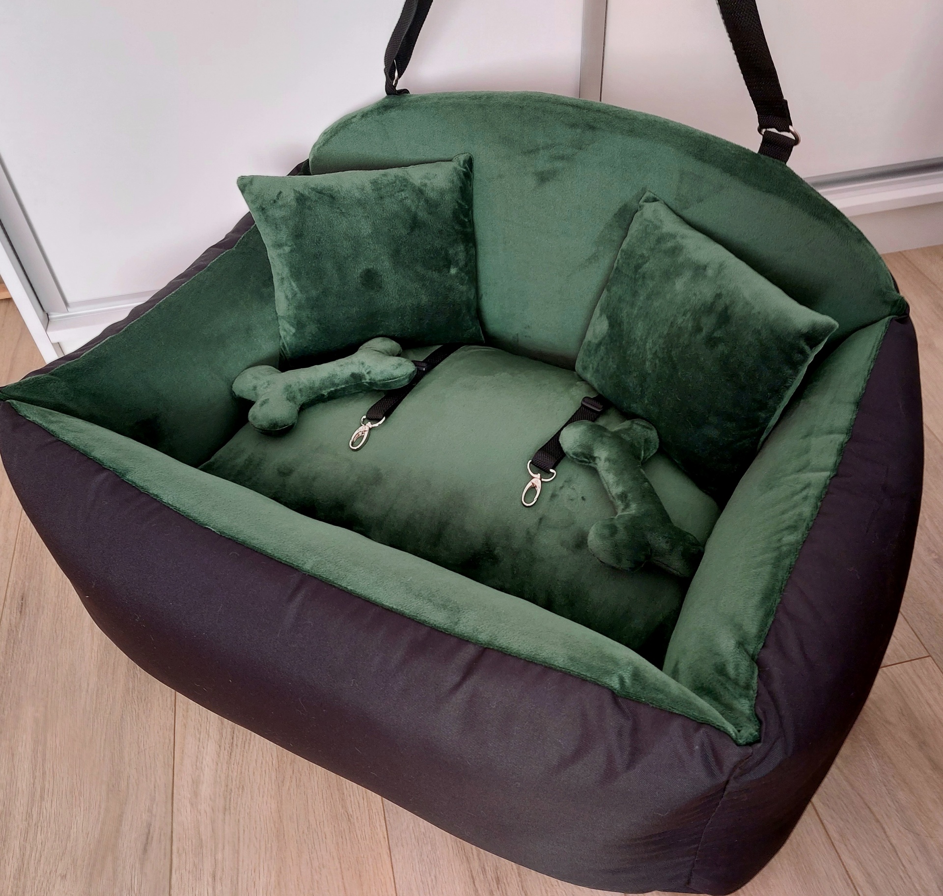 Elegantná zeleno-čierna autosedačka pre dvoch psíkov bez vyšivky Tá zelená farba je tak prekrásna, bohužiaľ ju nikdy nedokážem nafotiť tak, ako vyzerá naživo určite potvrdia aj zákazníci, ktorí už majú sedačku v tejto farbe Rozmer 70x50cm.