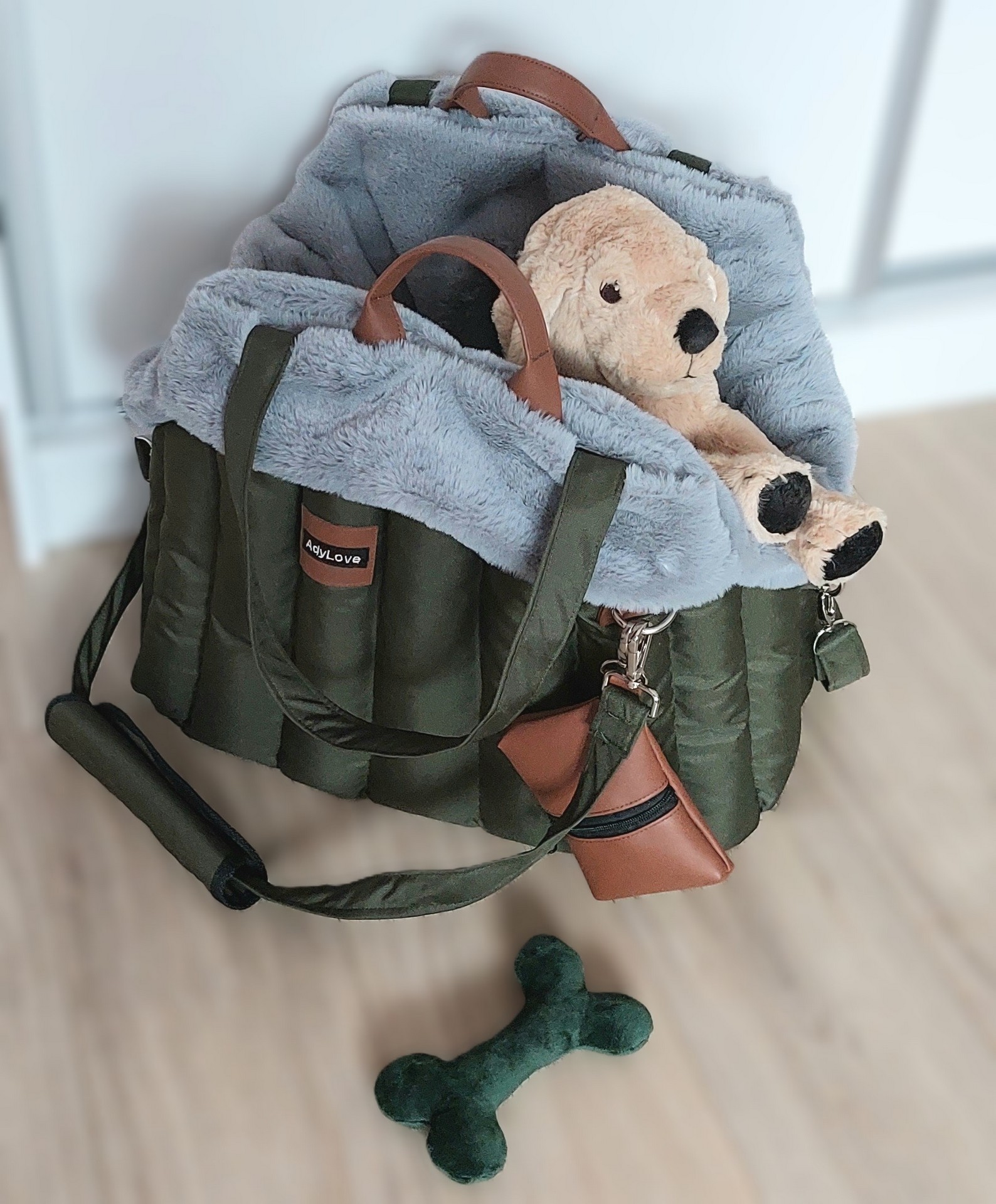 Prenosná taška 29.12.2023.Prenosná taška rozmer 50 x 30 cm v zelenej army farbe. Koženkové doplnky hnedé. Vnútro kožušina hnedá - vyberateľná. Tvrdená podložka vo vodeodolnej látke, mäkky vankúš, popruh na uchytenie psíka. Taška cestuje do Nemecka.