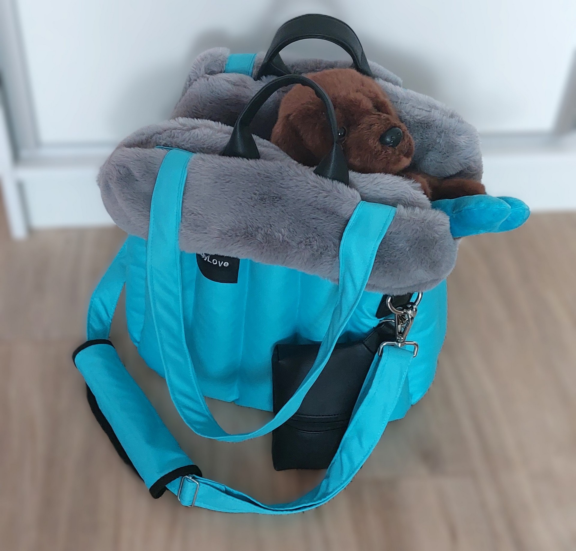 Užasna jemná tyrkysova"frozen" taška pre maličkého hafana, v rozmeroch 35x20cm so šedou vyberateľnou kožušinkou. Naozaj veľmi pekná kombinácia.
