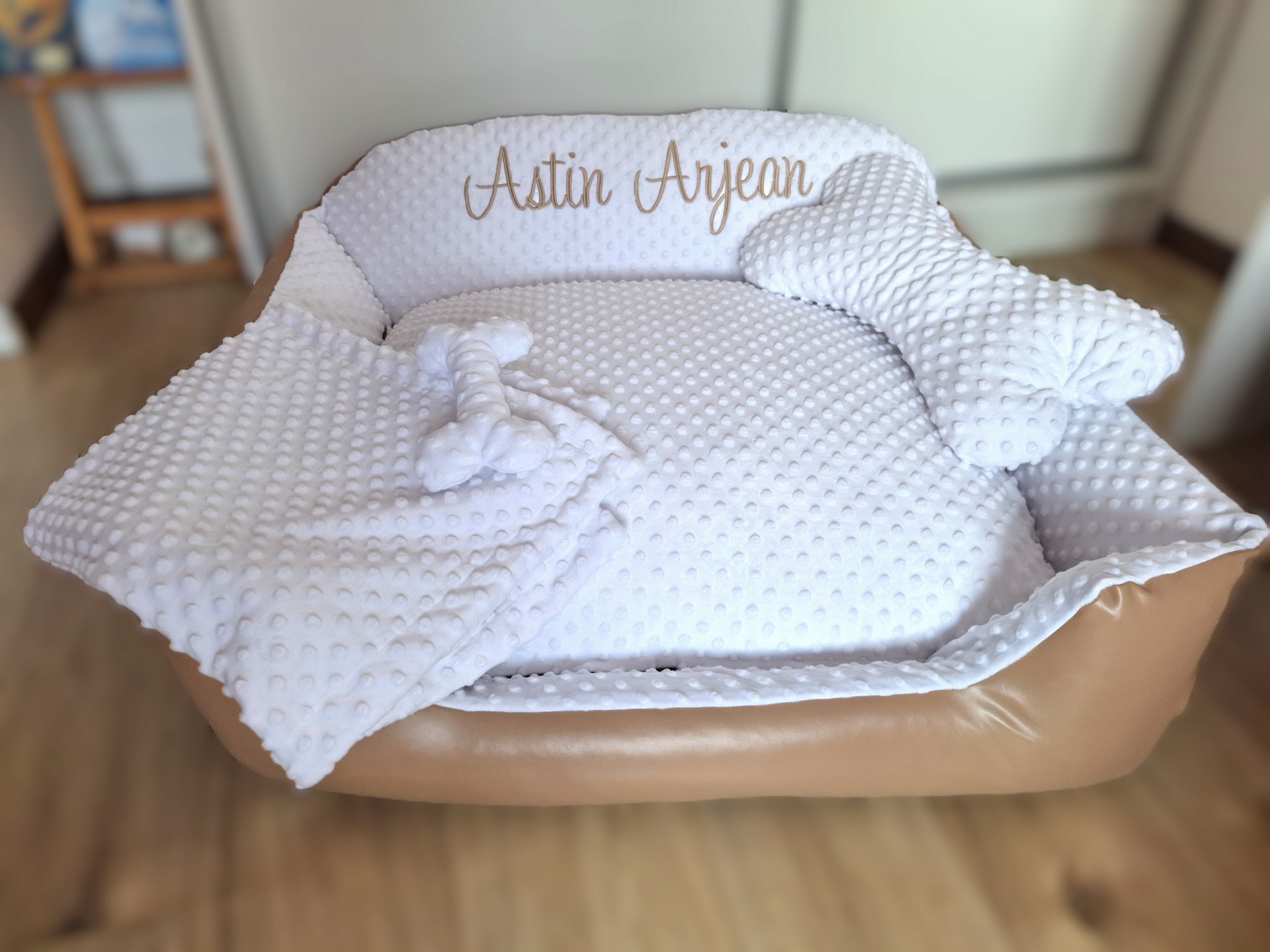 Peliešok pre Astin Arjean v kombinácii béžovej koženky a bielej bodky vo veľkosti 80x65cm. Deka vo velkosti 80x65cm a kostička ako vankúš. Ďakujeme