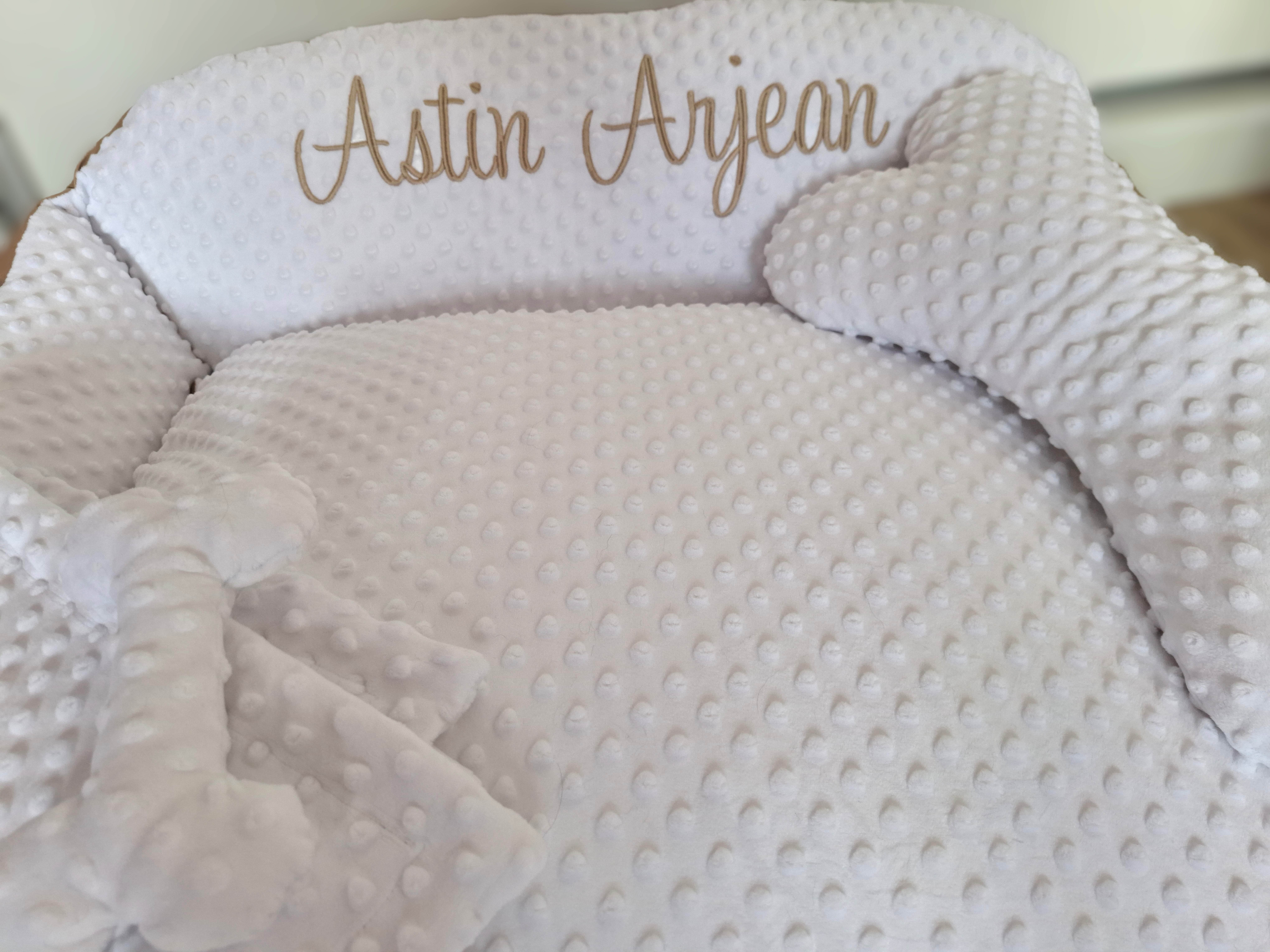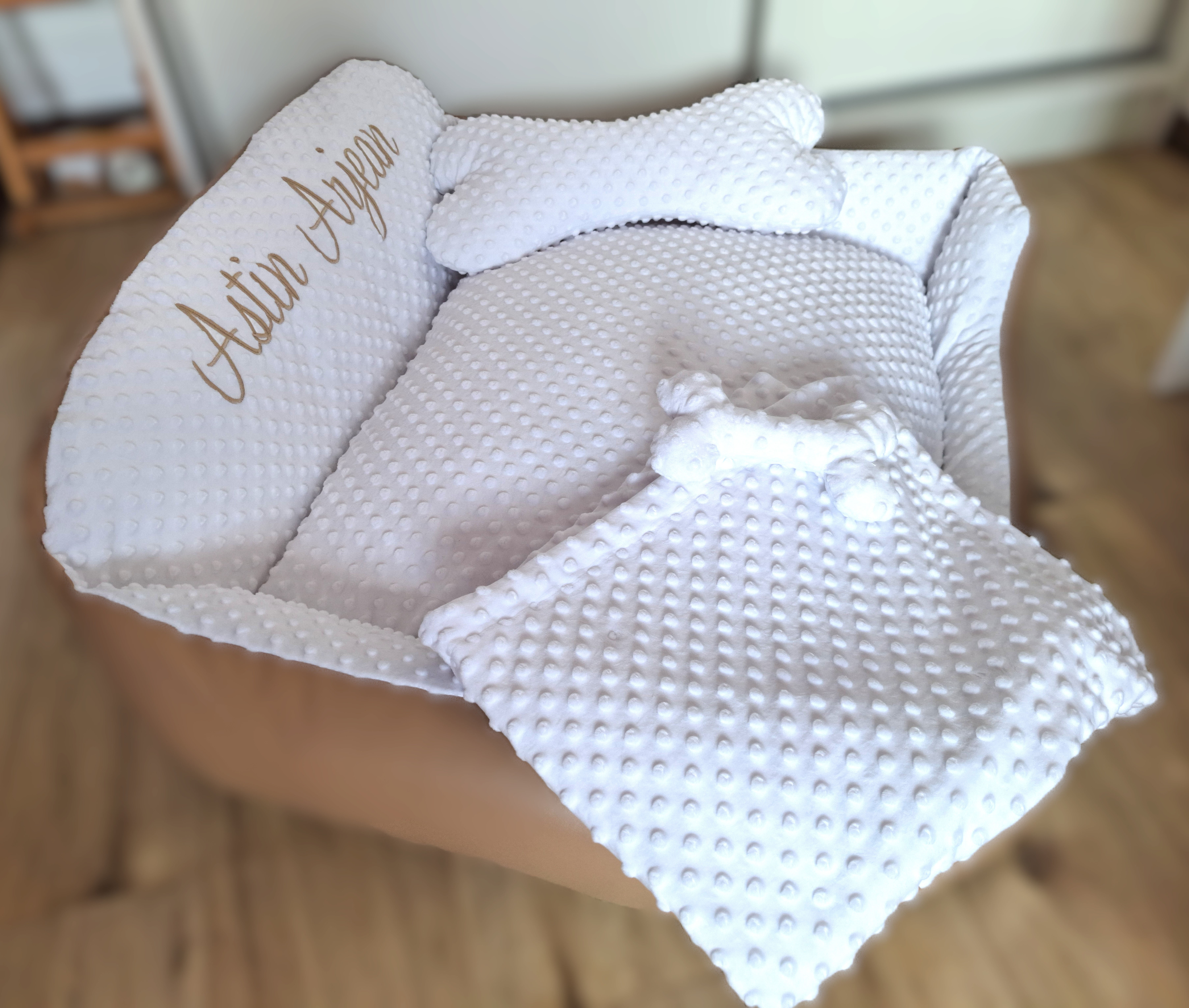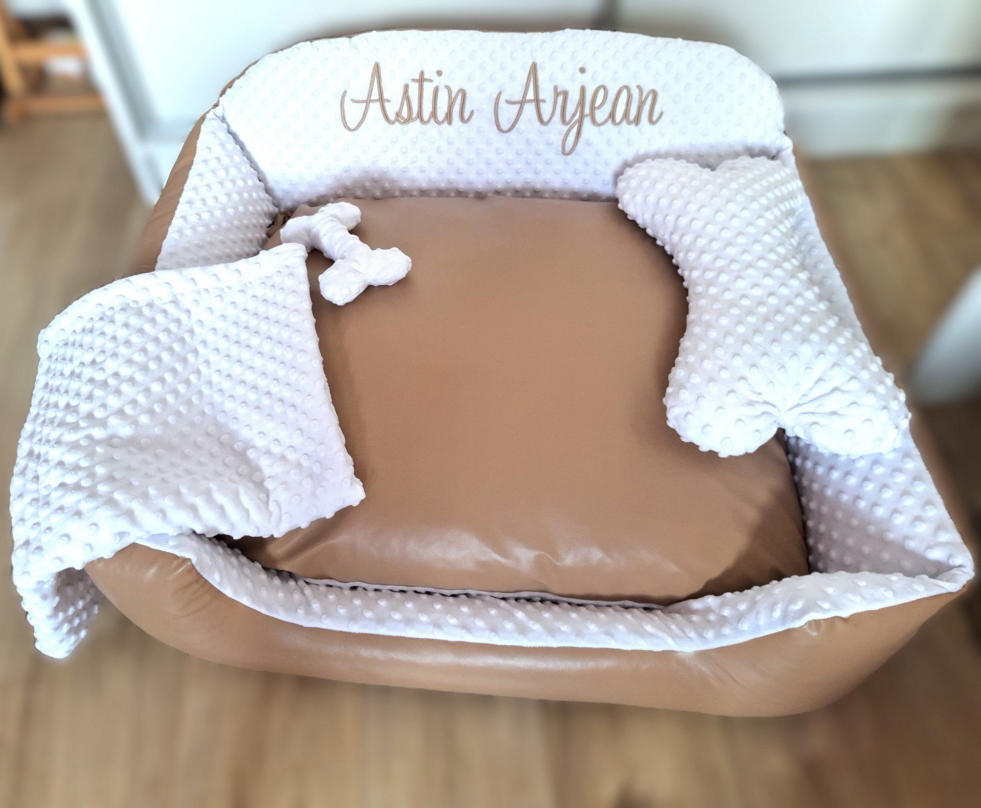 Peliešok pre Astin Arjean v kombinácii béžovej koženky a bielej bodky vo veľkosti 80x65cm. Deka vo velkosti 80x65cm a kostička ako vankúš. Ďakujeme