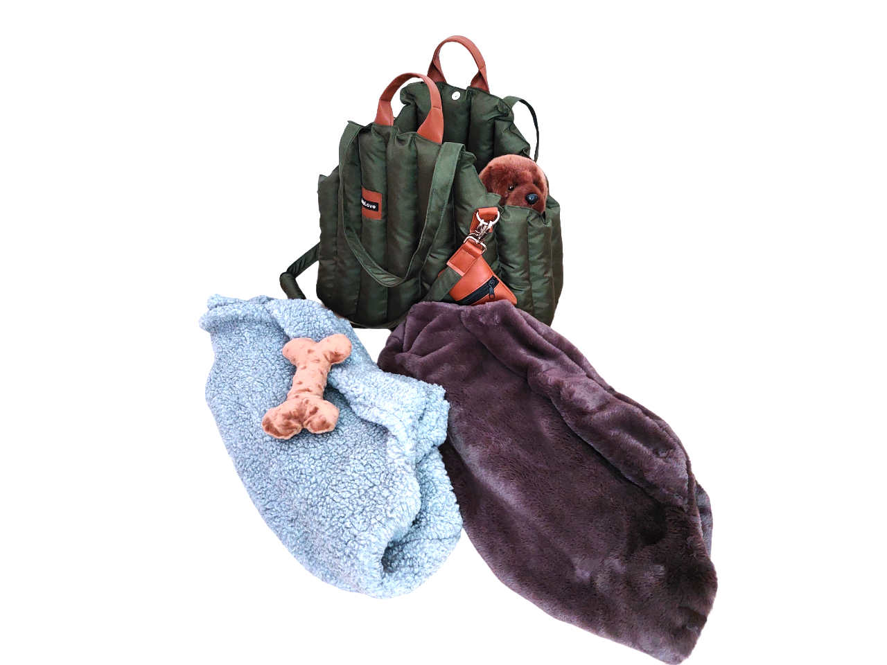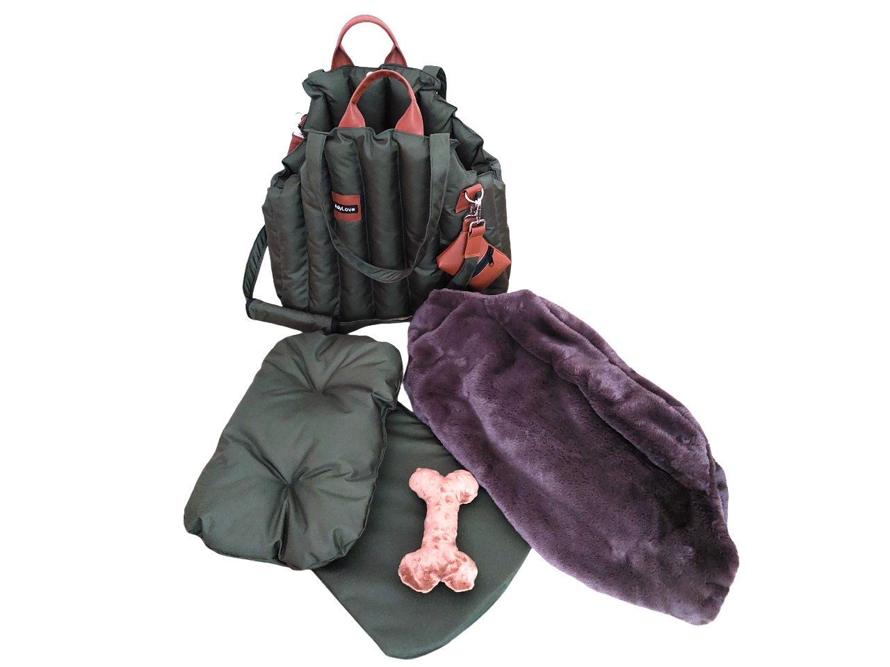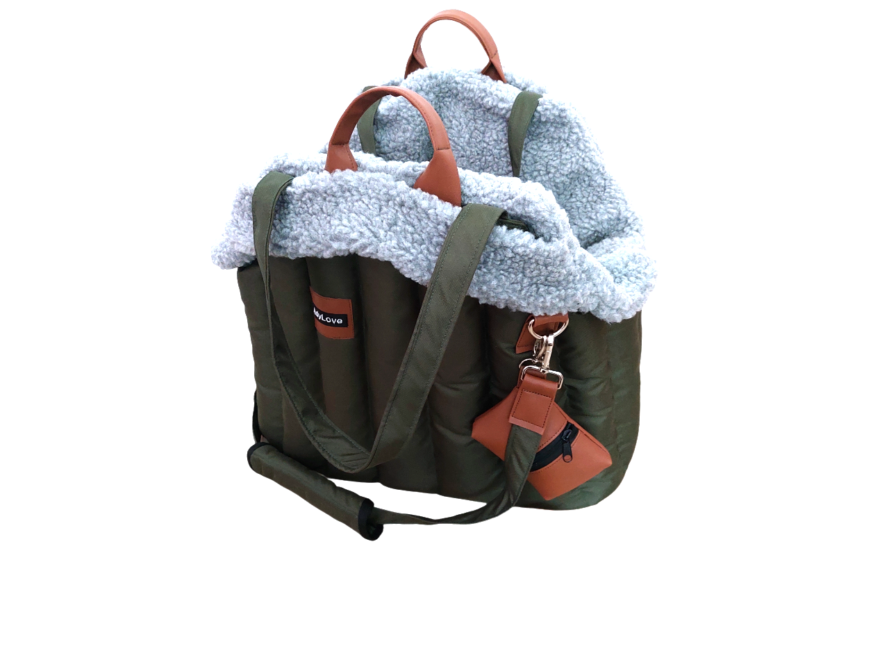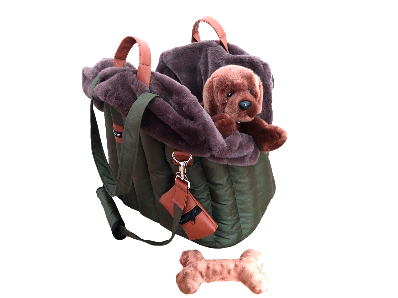 Prenosná taška rozmer 50 x 30 cm v zelenej army farbe. Koženkové doplnky hnedé. Vnútro kožušina hnedá - vyberateľná. Tvrdená podložka vo vodeodolnej látke, mäkky vankúš, popruh na uchytenie psíka. Taška cestuje do Nemecka.